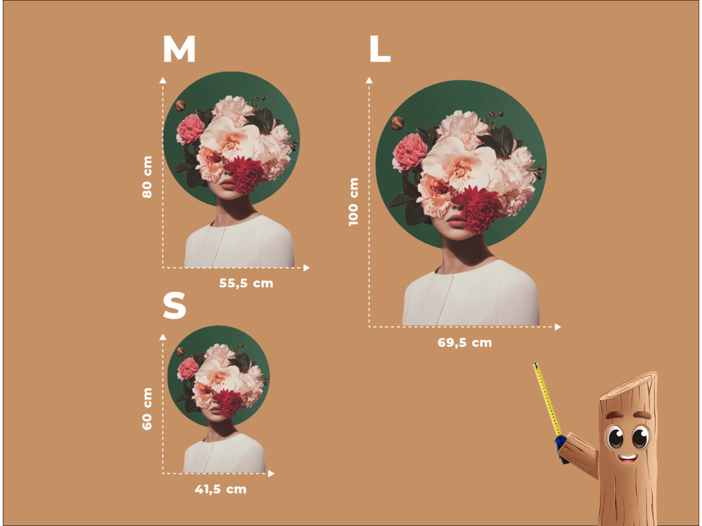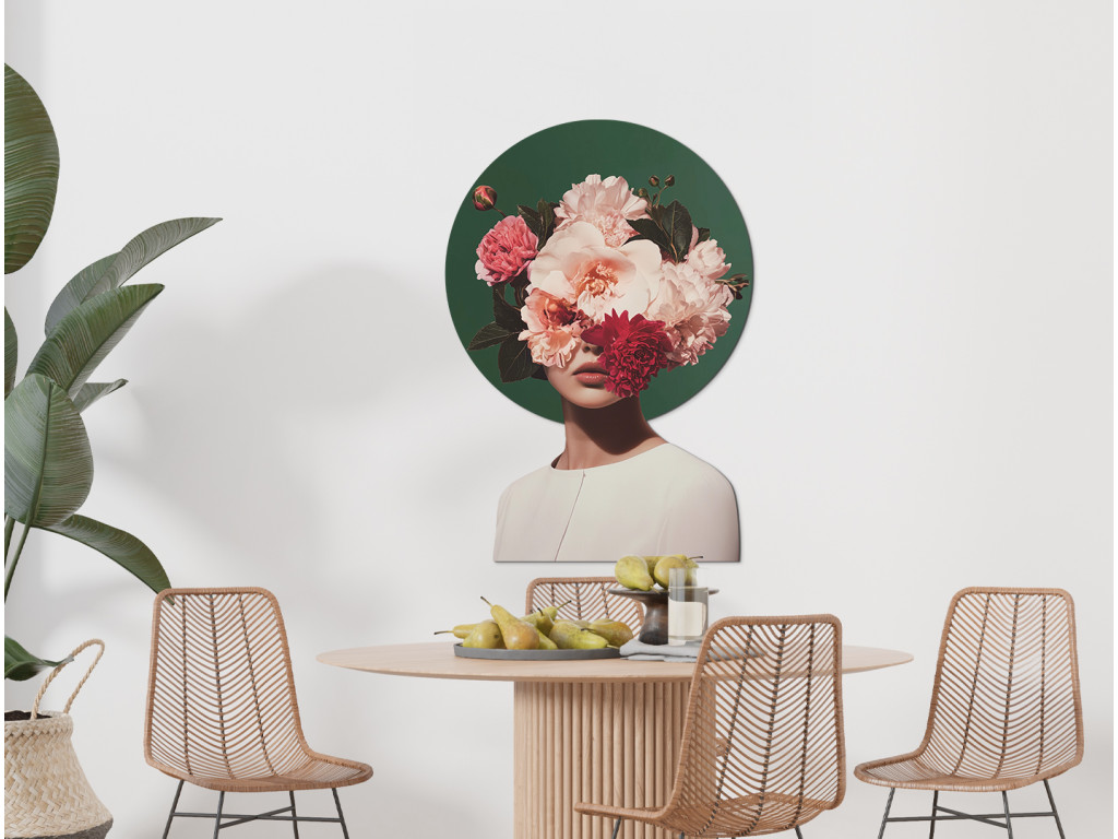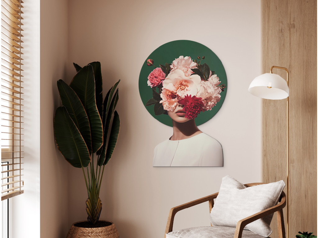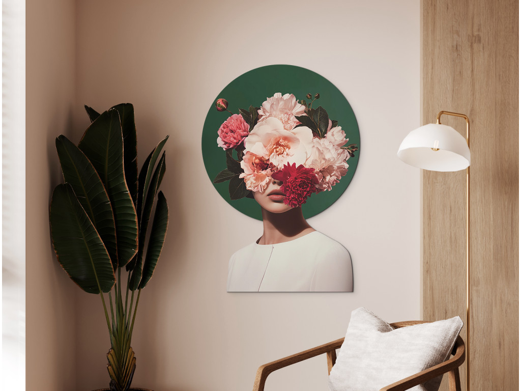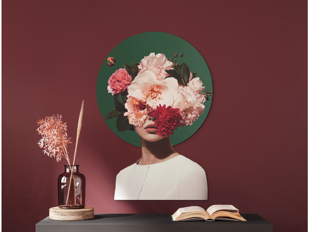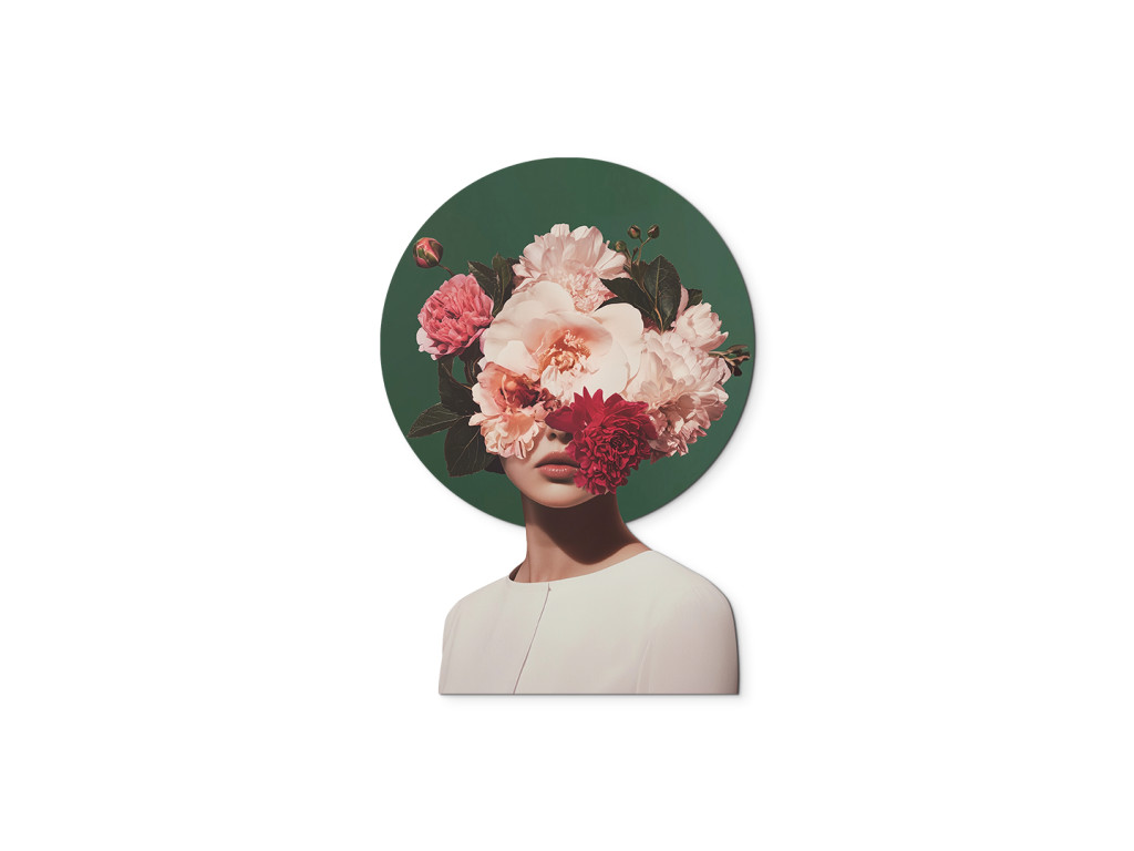A Búvóhely a virágok szépségében kép egy nőalakot ábrázol, akinek arca egy gazdag, rózsaszín és piros virágokból álló csokor mögé rejtőzik, sötét lomb ölelésében, miközben a virágok egy sötétzöld, kör alakú háttéren emelkednek ki, amely kontrasztban áll az alak fehér ruhájával és a kép tiszta fehér hátterével. A látható ajkak és a nyak egy része finoman, mégis sejtelmesen hat, így a mű a törékenységet, az anonimitást és az emberi szépségnek a természet harmóniájával való összhangját fejezi ki, miközben a kontraszt eleganciája és a sejtelmesség különleges atmoszférát teremt.
