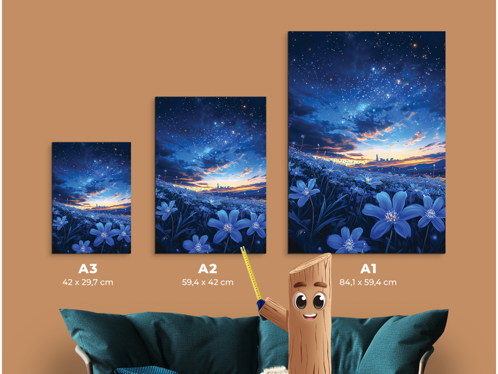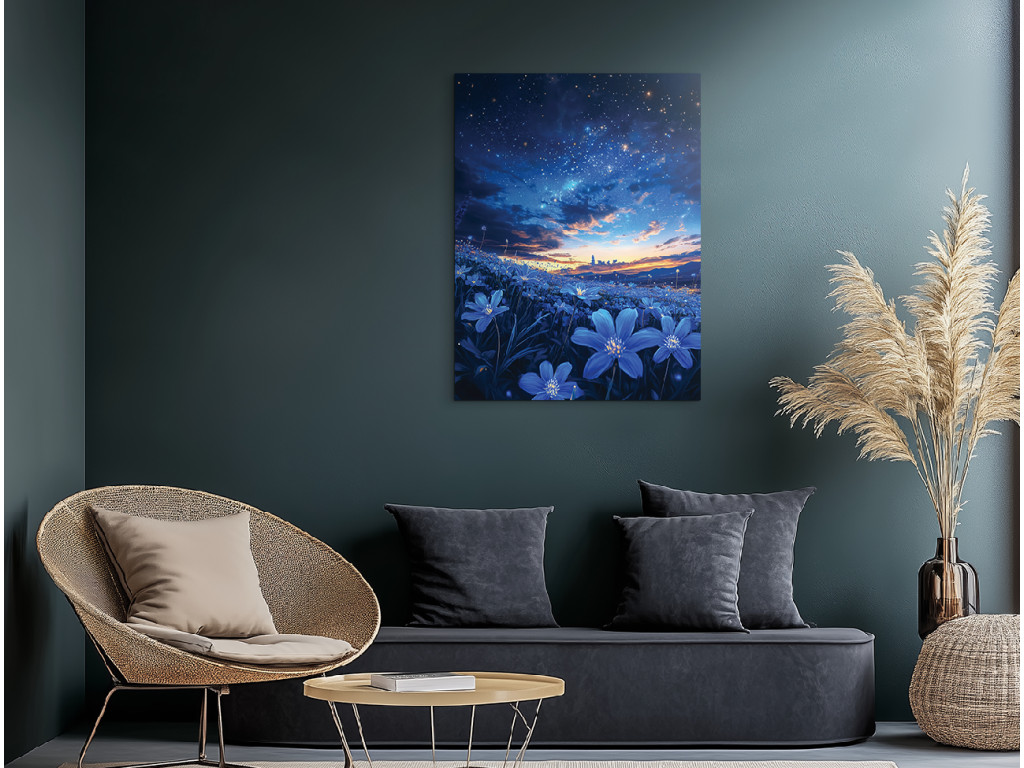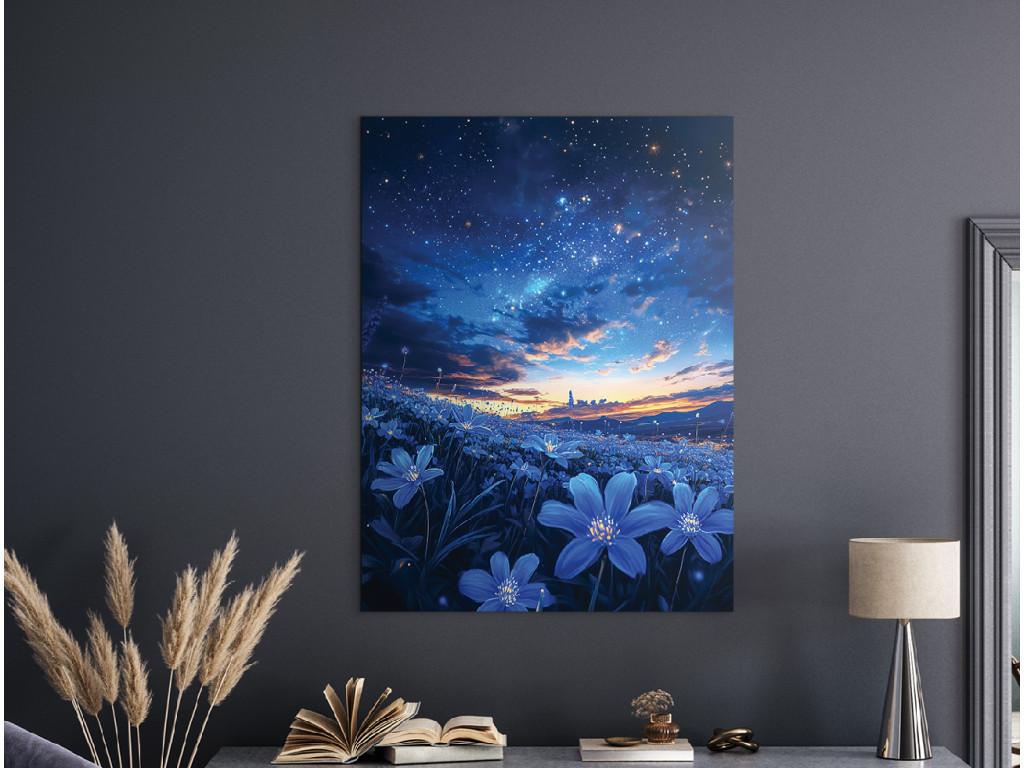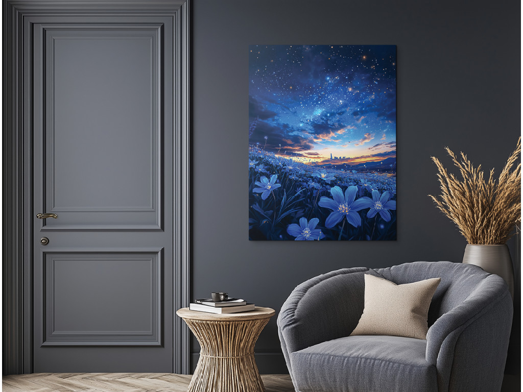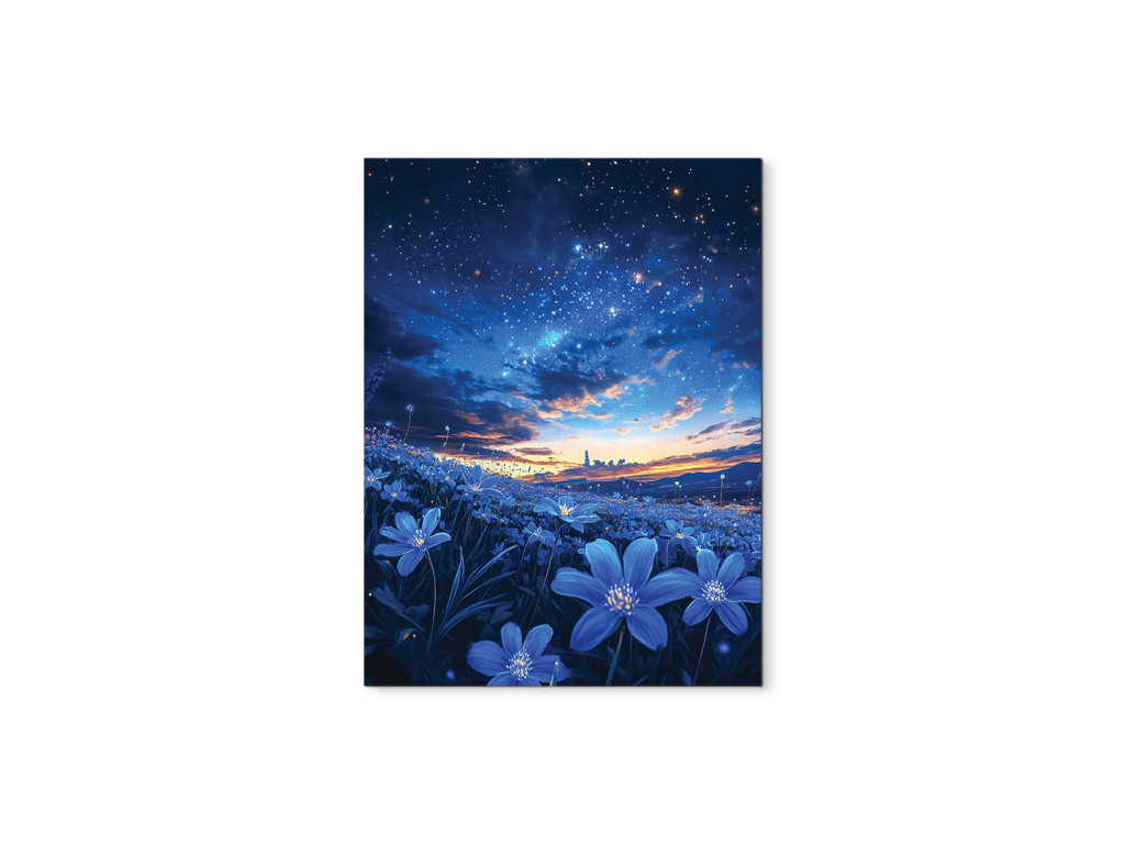 A Csillagos mező egy egyetlen panelből álló festmény, amely a csillagos éjszakai égbolt és a Tejútrendszer pompáját ötvözi egy kék árnyalatú virágmezővel. A sötét égbolt és az élénk virágok közötti finom kontraszt békés, álomszerű hangulatot teremt. Ideális hálószobába, olvasósarokba vagy modern belső tér nyugtató elemeként.