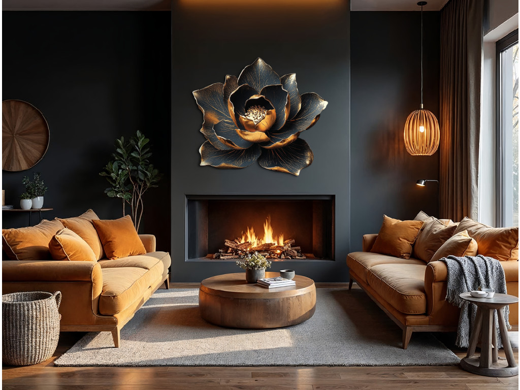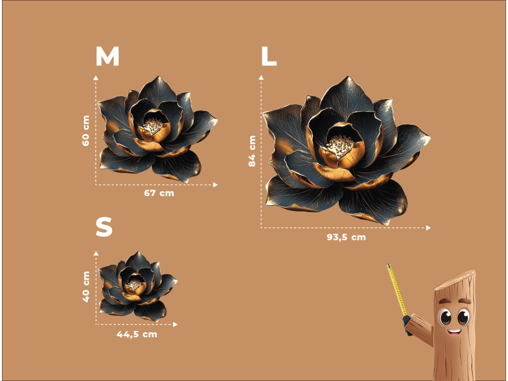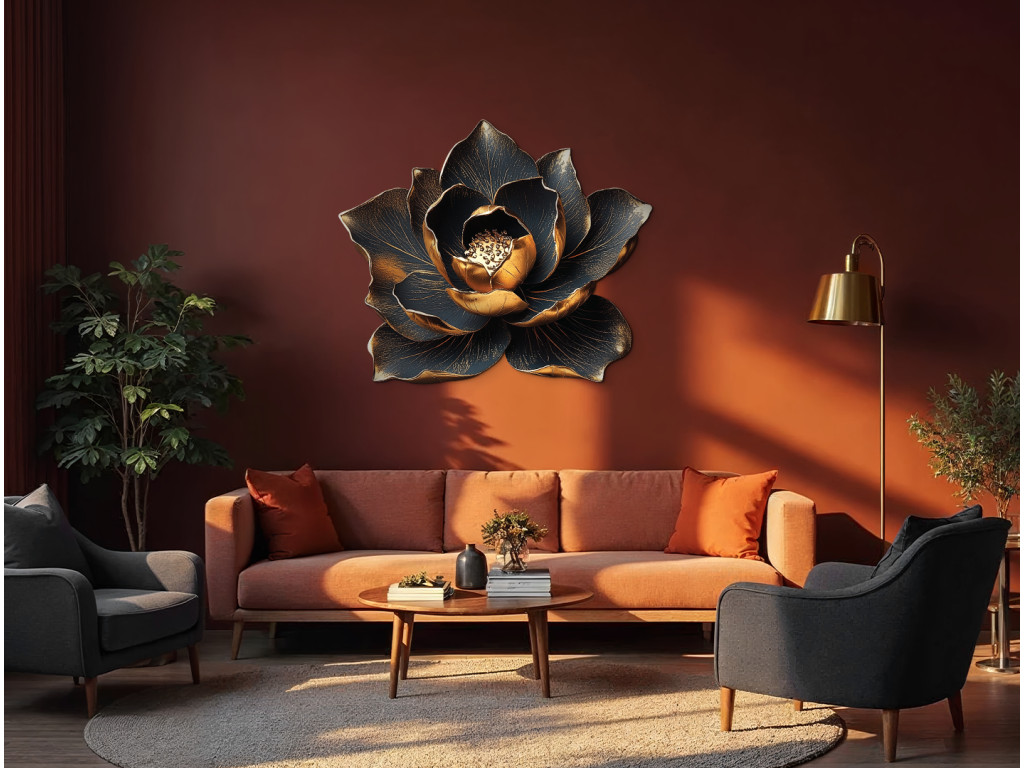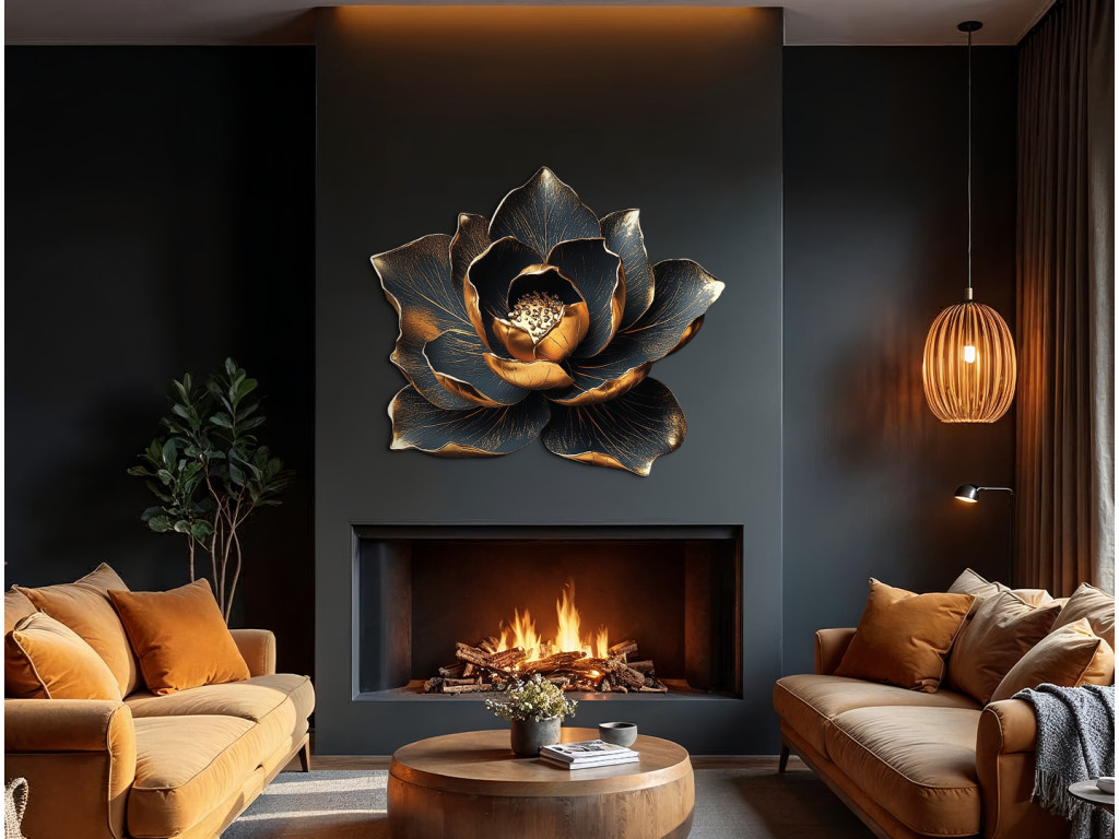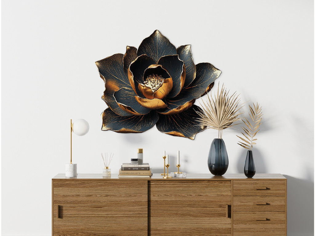 Ez az elegáns lótuszvirágos fali dekoráció a fekete szirmokat arany és sárgaréz részletekkel ötvözi, feltűnő kontrasztot és luxusérzetet teremtve. A koncentrikus körökben elrendezett szirmok többrétegű szerkezete telt és mély megjelenést kölcsönöz, míg a finom fémes díszítések kiemelik a formát és kifinomult jelleget kölcsönöznek a darabnak.