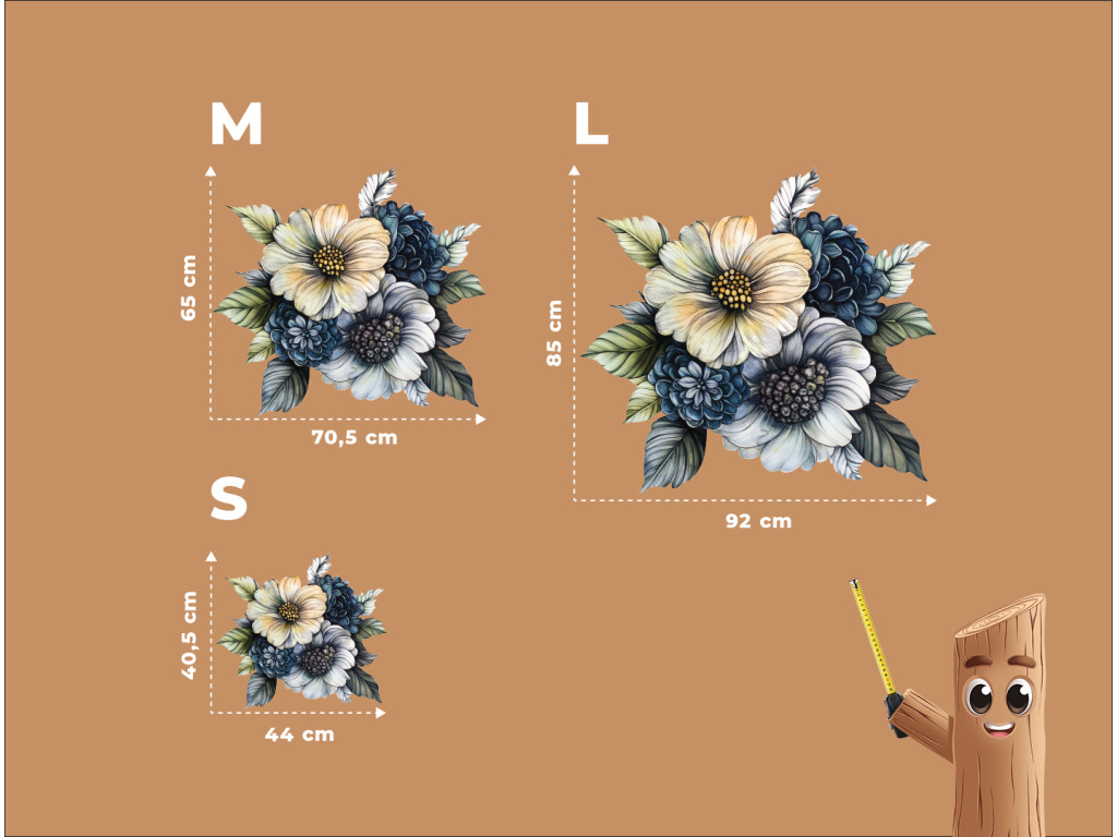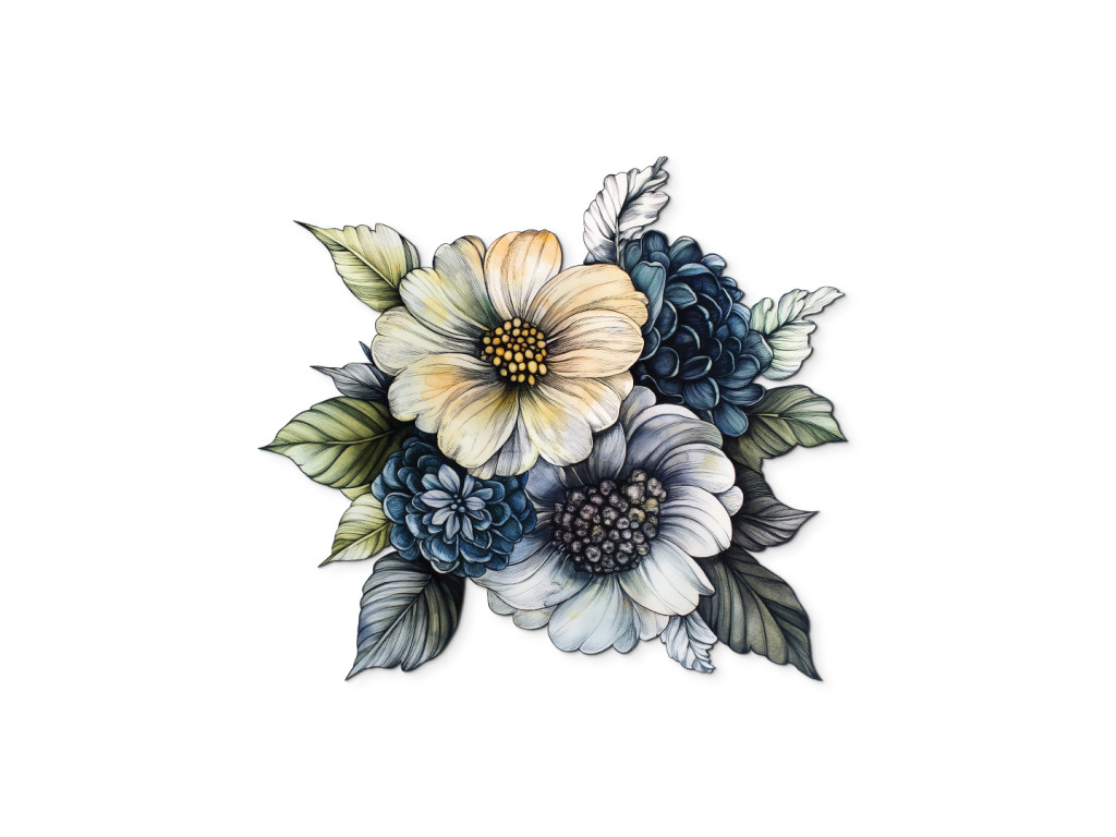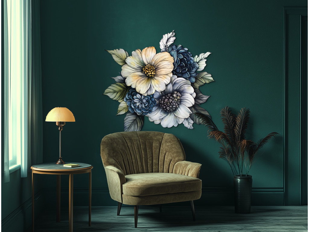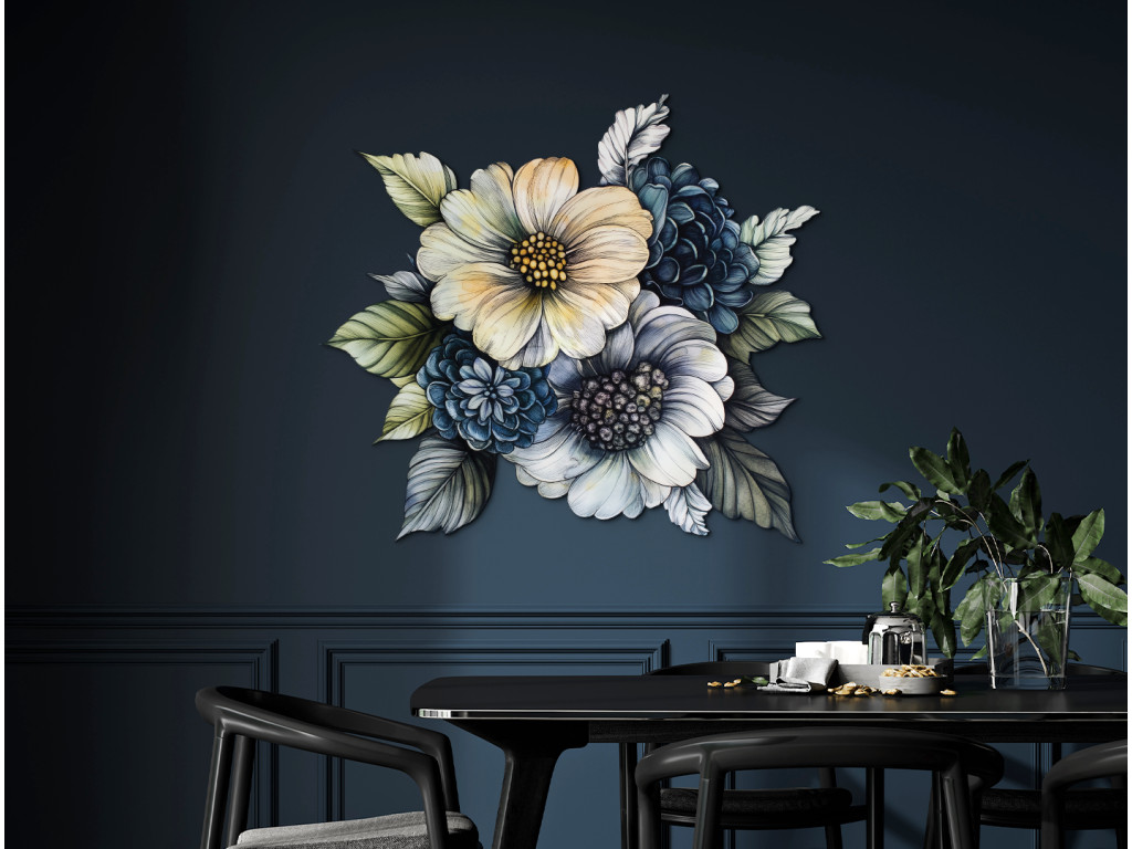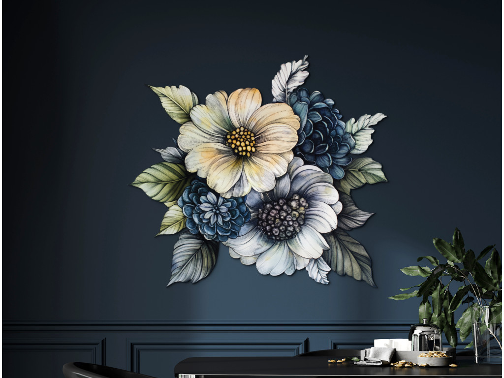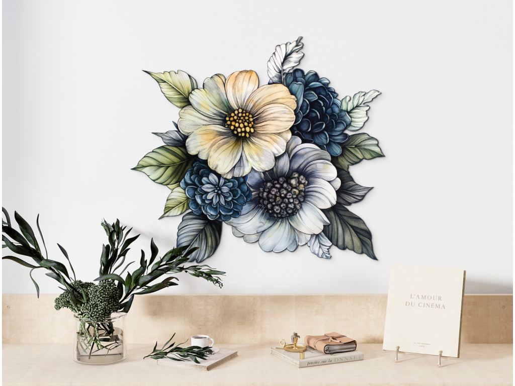 A sárga, kék és zöld árnyalatok finom átmeneteivel díszített festett csokor könnyed, friss és természetes hatást kelt. A szigorú kontúrok nélküli laza stílus kiemeli a színek hangulatát és mozgását, így egy harmonikus, lágysággal és egyensúlynal teli egészet teremt. Ez a dekoráció a virágok egyszerű szépségét ragadja meg.
