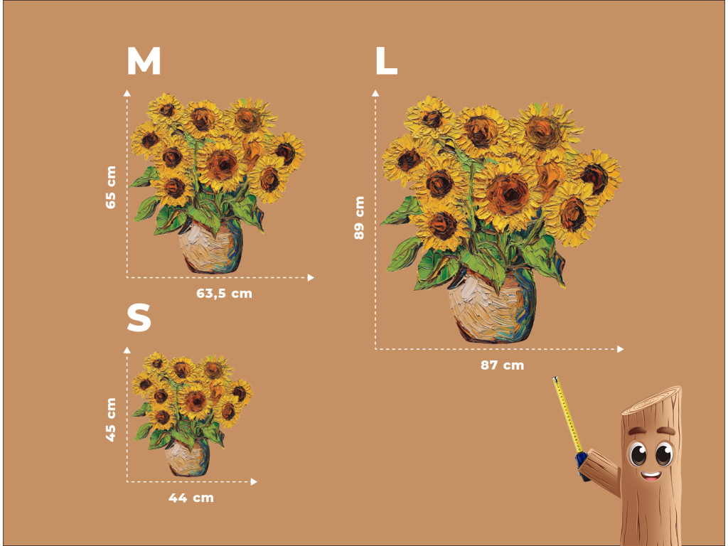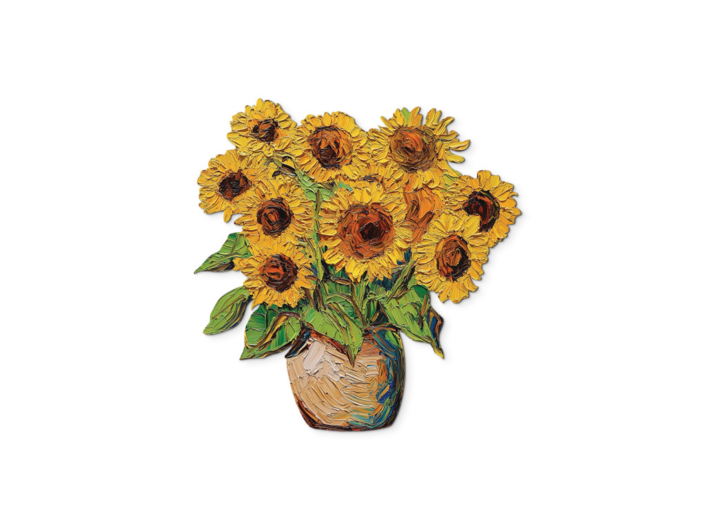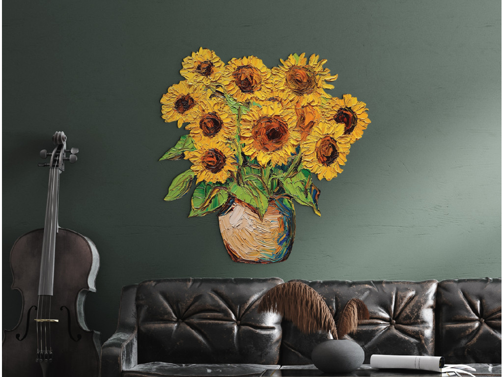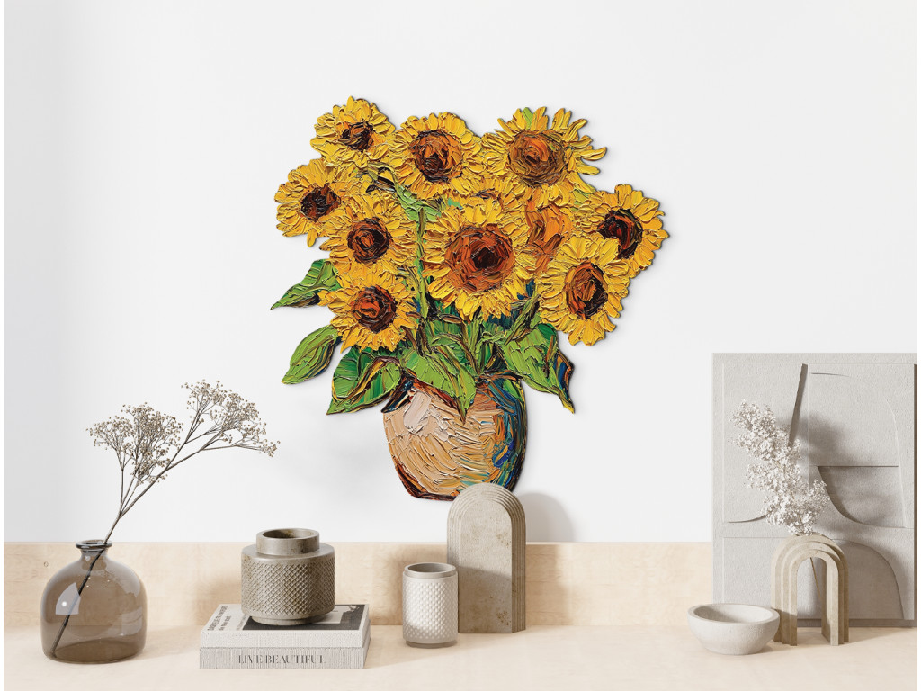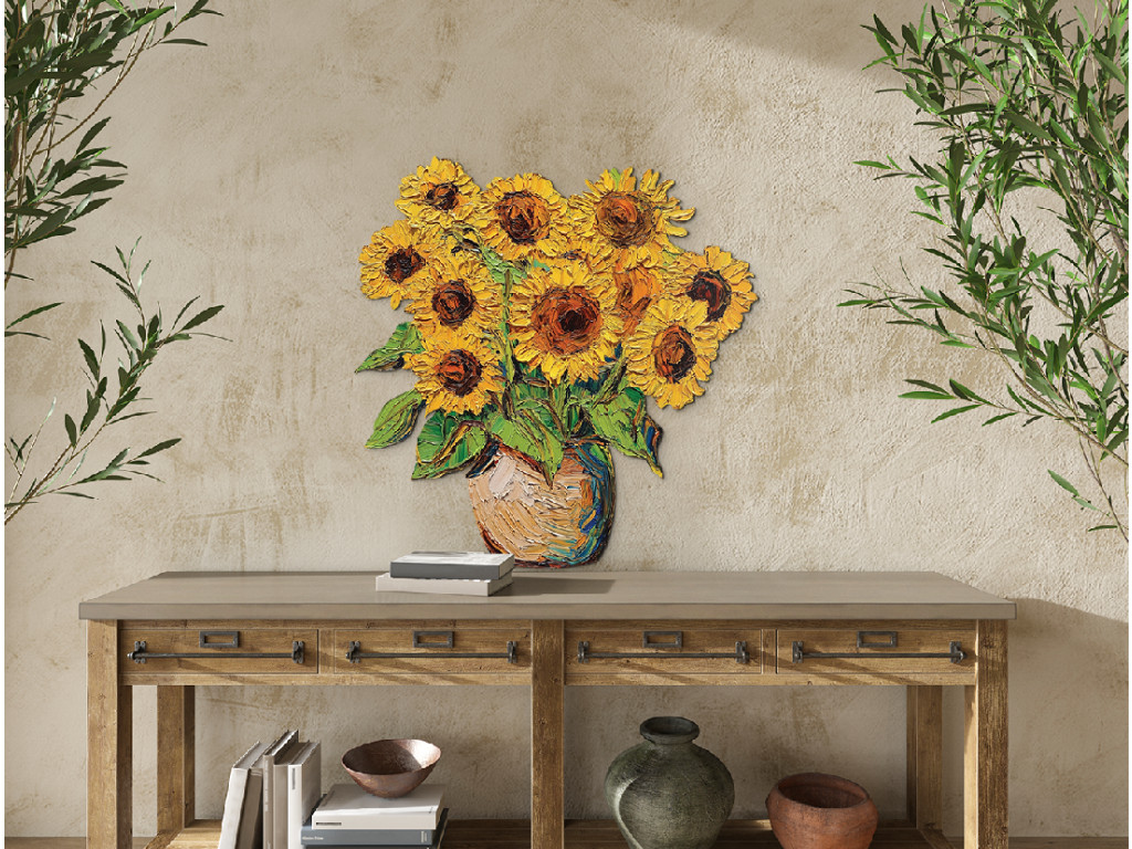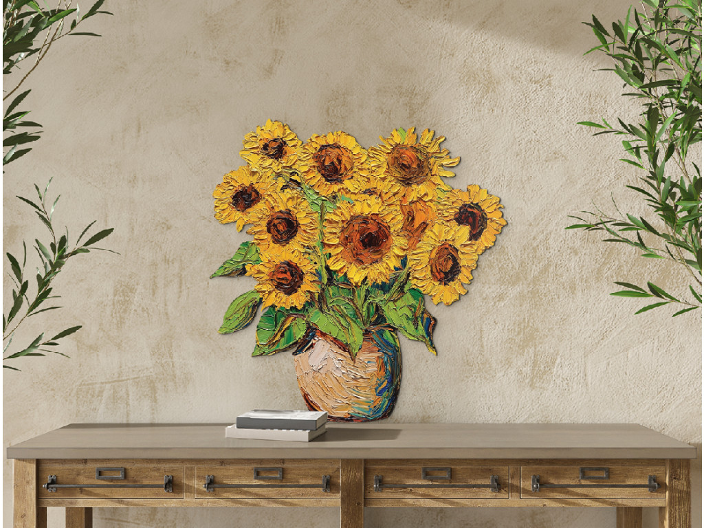 A vázában elhelyezett festett napraforgókkal díszített faldekoráció melegséget, egyszerűséget és rusztikus eleganciát sugároz. Az élénk sárga virágok fénysugarakként világítják meg a teret. A mű időtlen bájt és optimizmust áraszt – mint egy soha véget nem érő nyári nap.