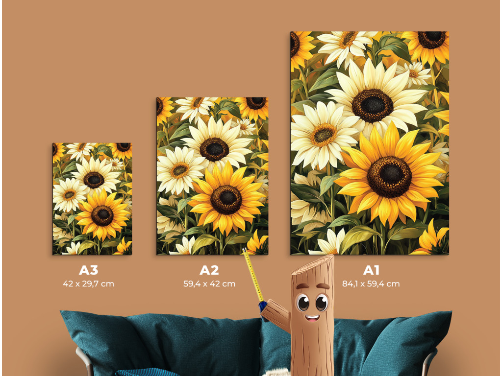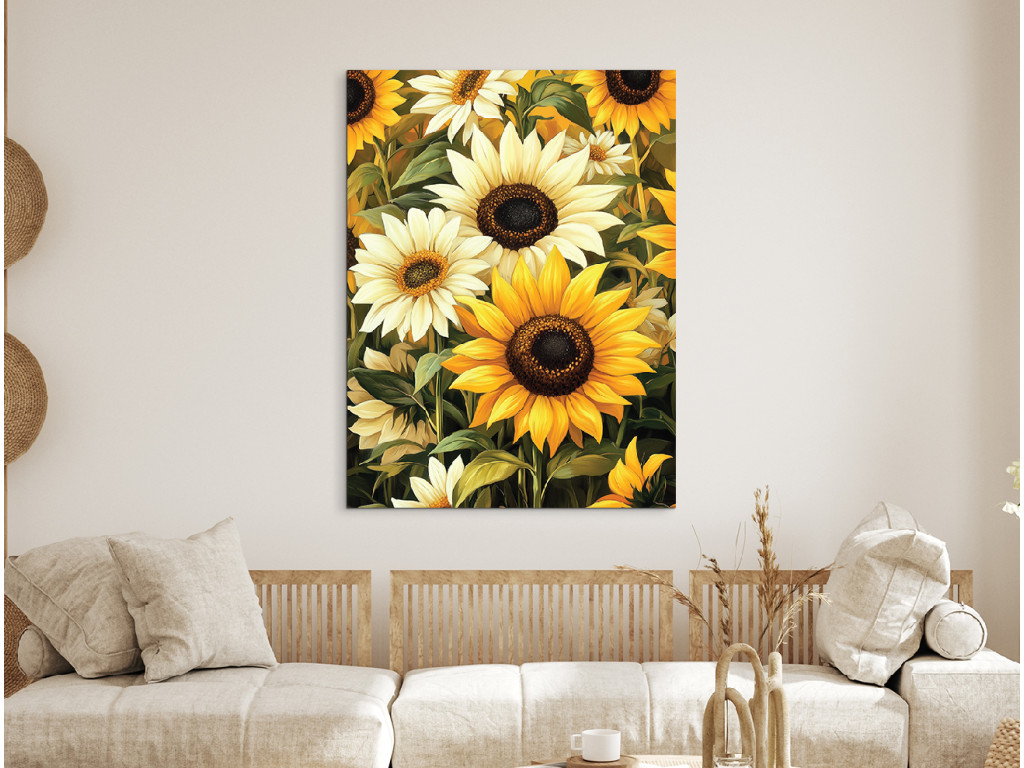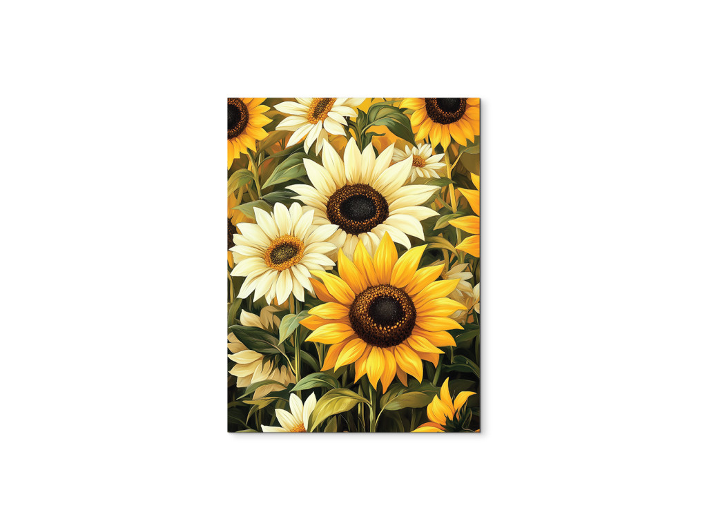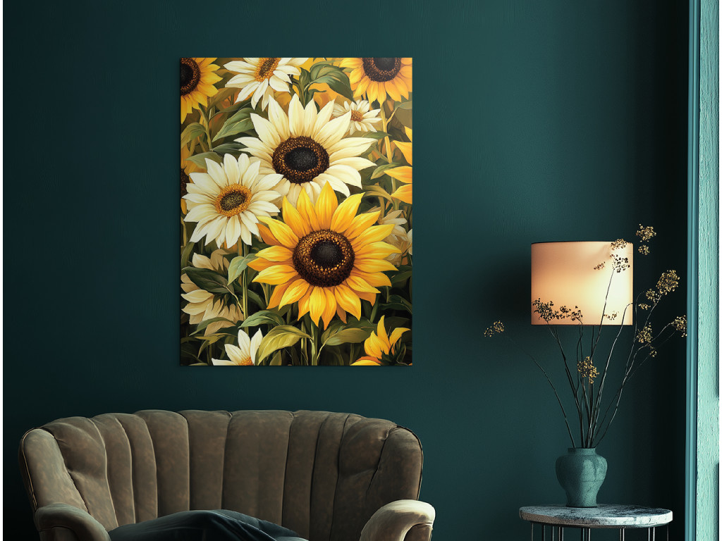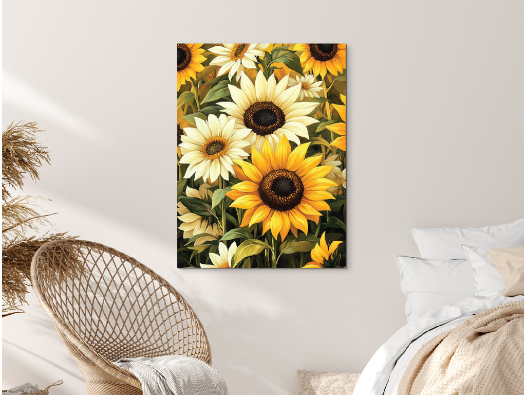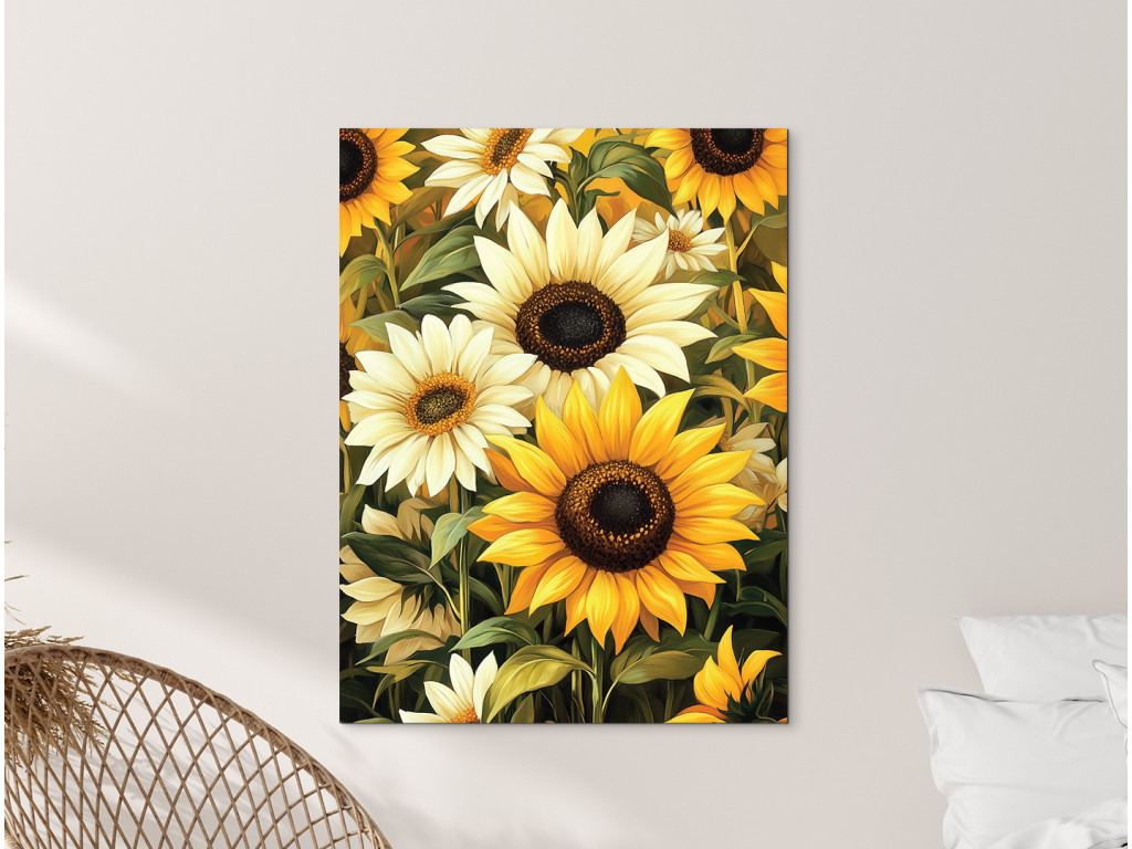 A Festett napraforgók egy dekoratív kép, tele melegséggel, örömmel és élettel - a részletekre való odafigyeléssel festett élénk virágok sokasága azt a benyomást kelti, mintha egy virágzó napraforgómezőre néznénk. A gazdag szín és a virágokkal teli kompozíció optimista és friss hatást kelt. Tökéletesen feldobja a konyha, az étkező vagy a vidéki stílusú nappali terét.