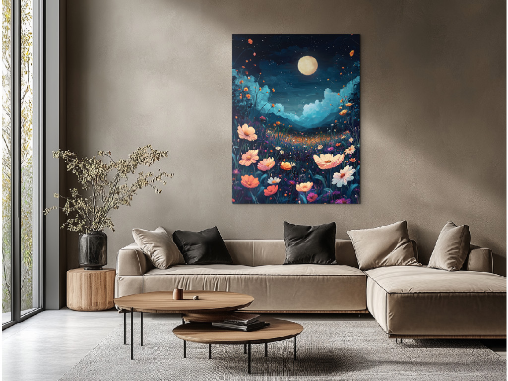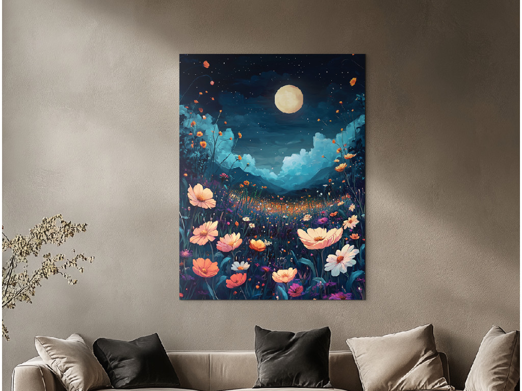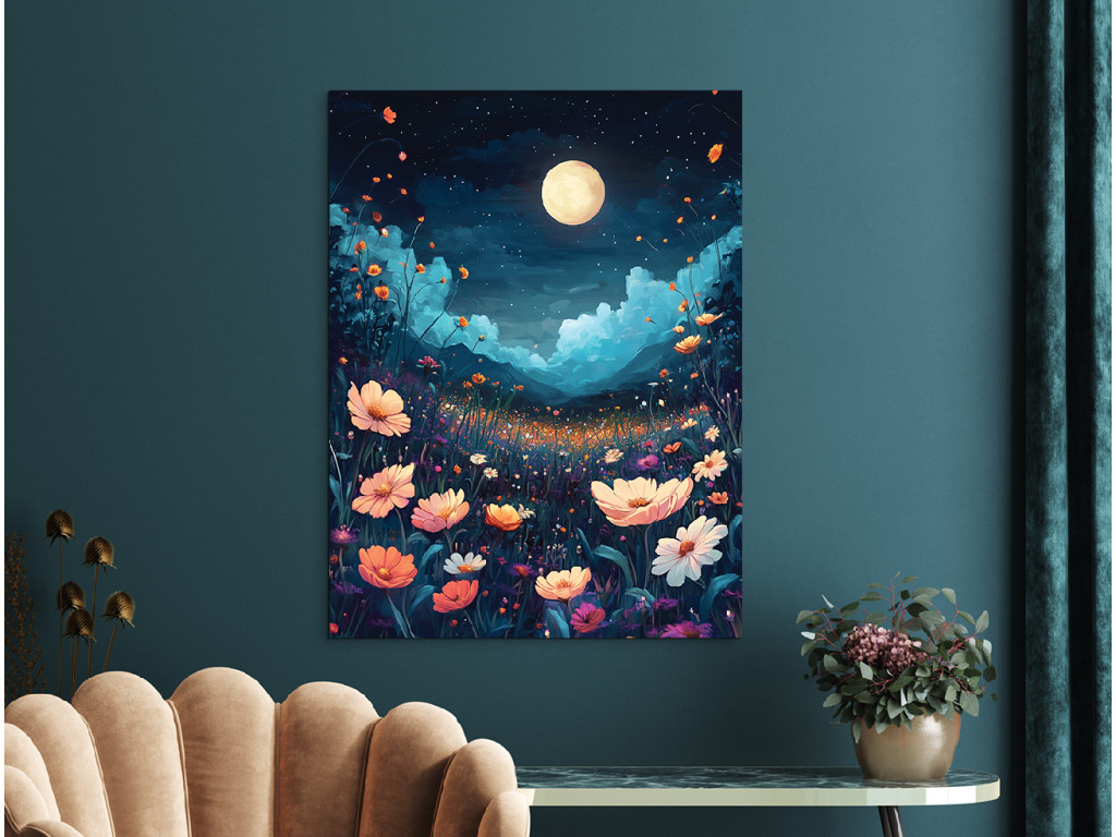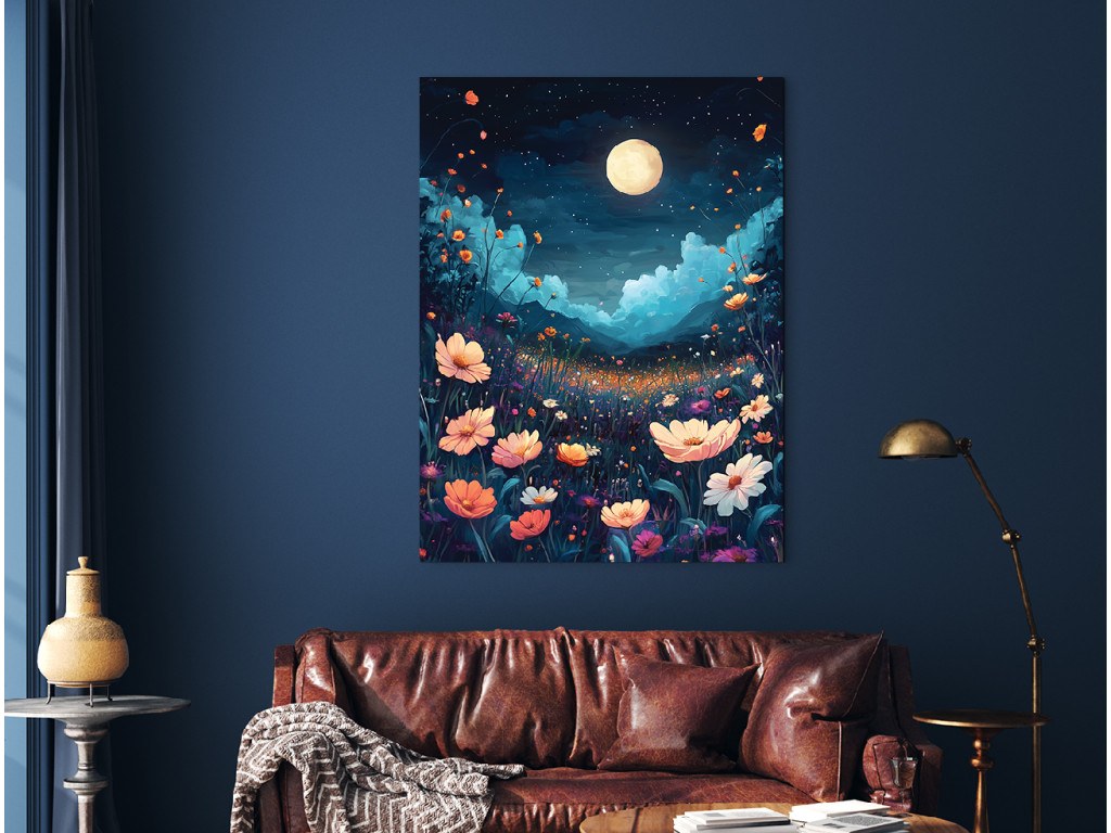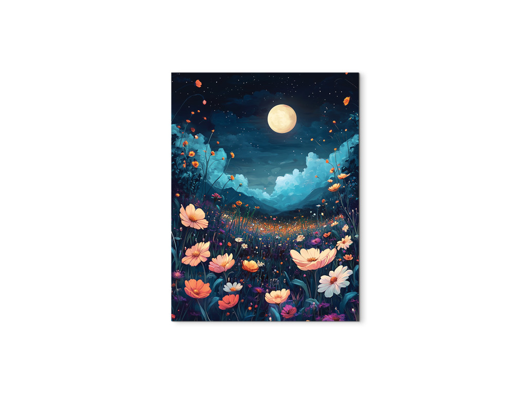 A Holdfényes rét egy kontrasztokkal és finom varázslattal teli festmény – színes mezei virágok nyílnak a sötétben, csak a halvány holdfény világítja meg őket. A sötét háttér előtti virágok színei egyszerre élénkek és álomszerűek, mintha a rét a saját csendes fényében ragyogna. A festmény békét, költészetet és egy csipetnyi éjszakai természetet hoz a térbe – ideális hálószobába, pihenőhelyiségbe vagy olvasósarokba.