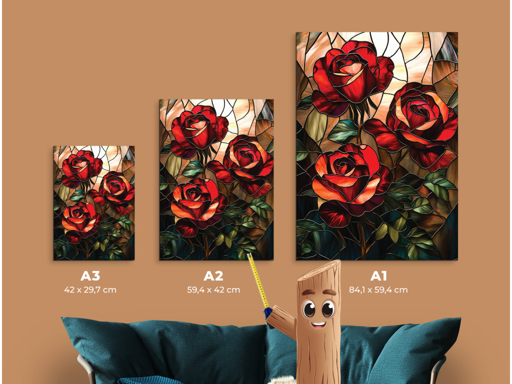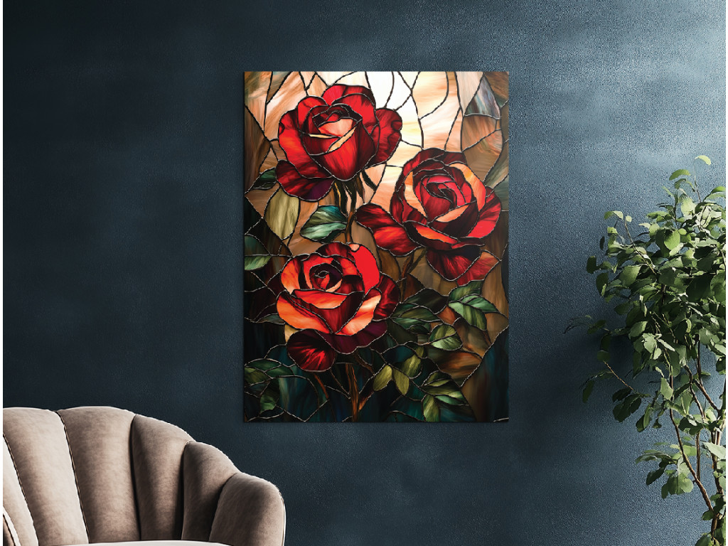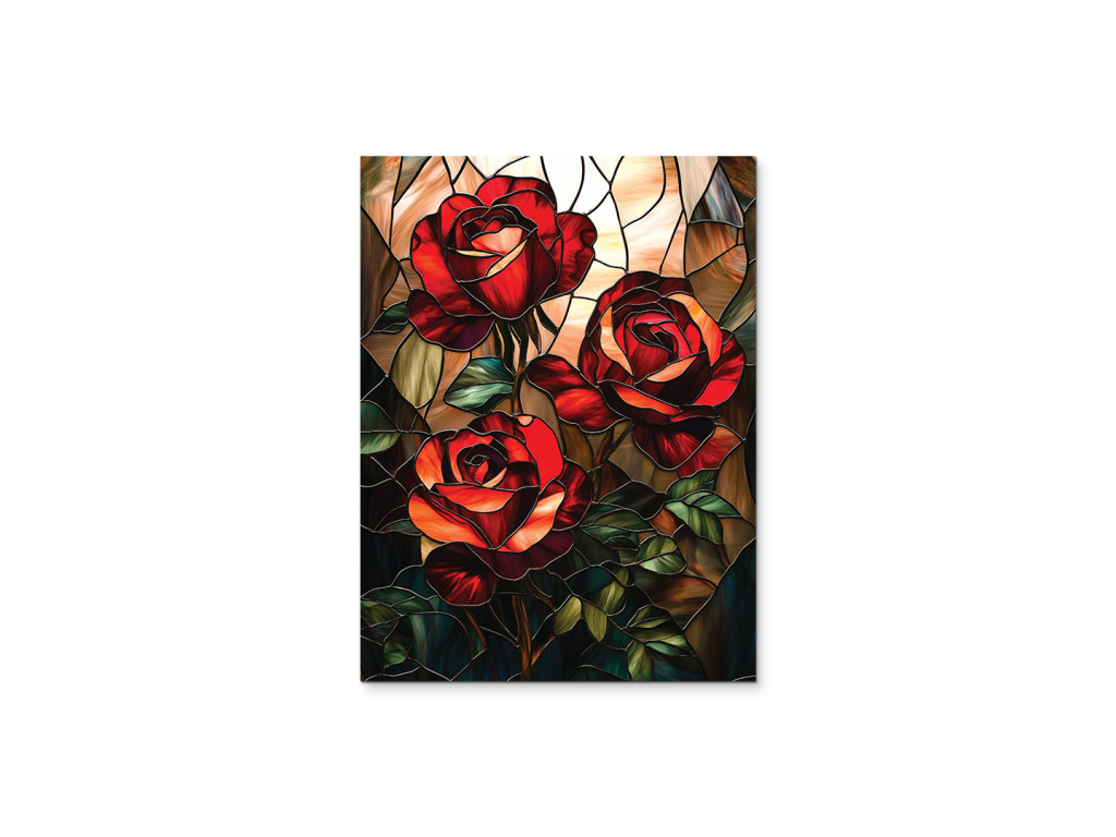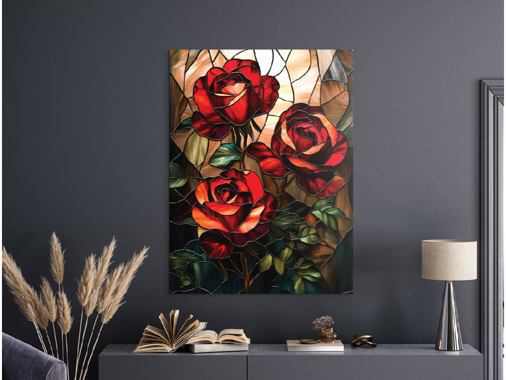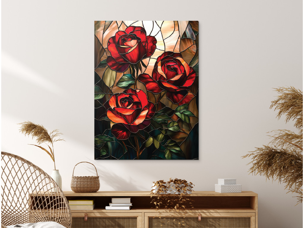 A Szenvedélyes rózsák mozaikja egy olyan festmény, amely mozaikos stílusban ötvözi a vörös intenzitását a fény és a színek játékával. Három vörös rózsa emelkedik ki a narancssárga, zöld és fekete árnyalatokkal teli háttérből, drámai és harmonikus kompozíciót hozva létre. Ez a festmény ideális domináns elemként egy olyan térben, amely erős vizuális élményt igényel - például egy nappaliban, hálószobában vagy stílusos galériában.