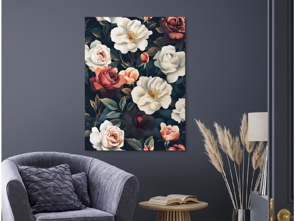 A Színes rózsák egy enyhén drámai hangulatú festmény, ahol a fehér és pirosra festett rózsák lágy szűrőhatással kiemelkednek egy sötétebb háttérből. A sötét színpaletta mélységet, eleganciát és enyhén misztikus hangulatot kölcsönöz a klasszikus motívumnak. Tökéletes hálószobába, könyvtárba vagy vintage vagy elbűvölő elemekkel teli enteriőrbe.