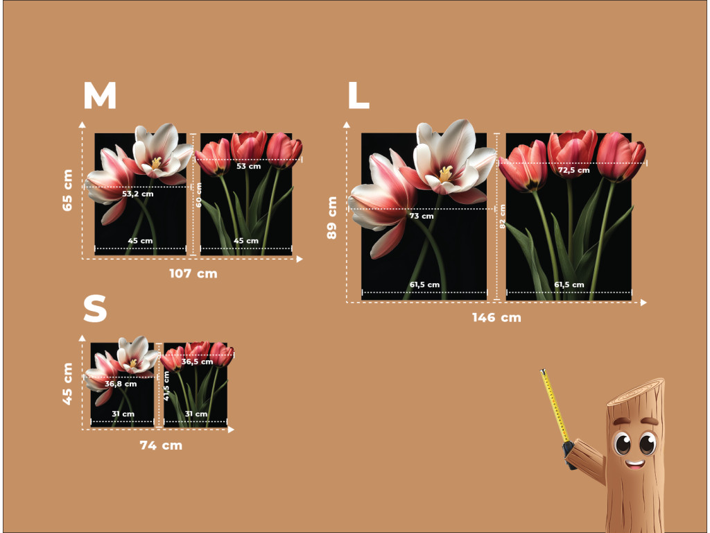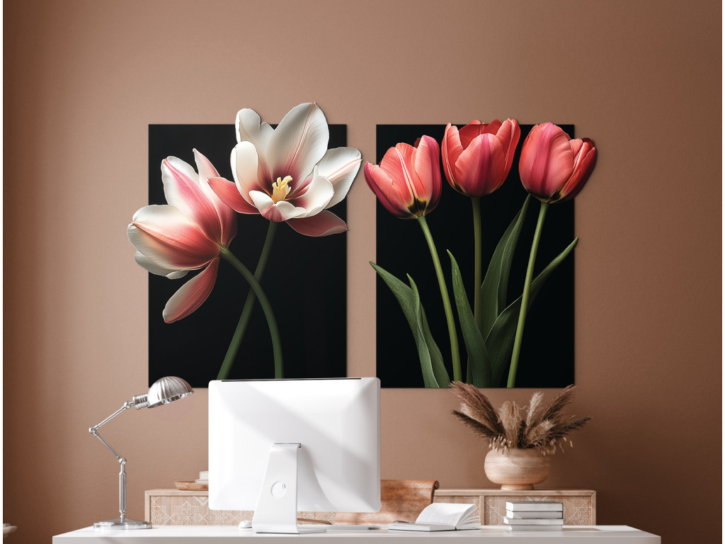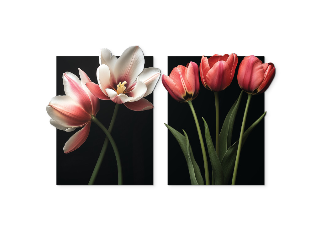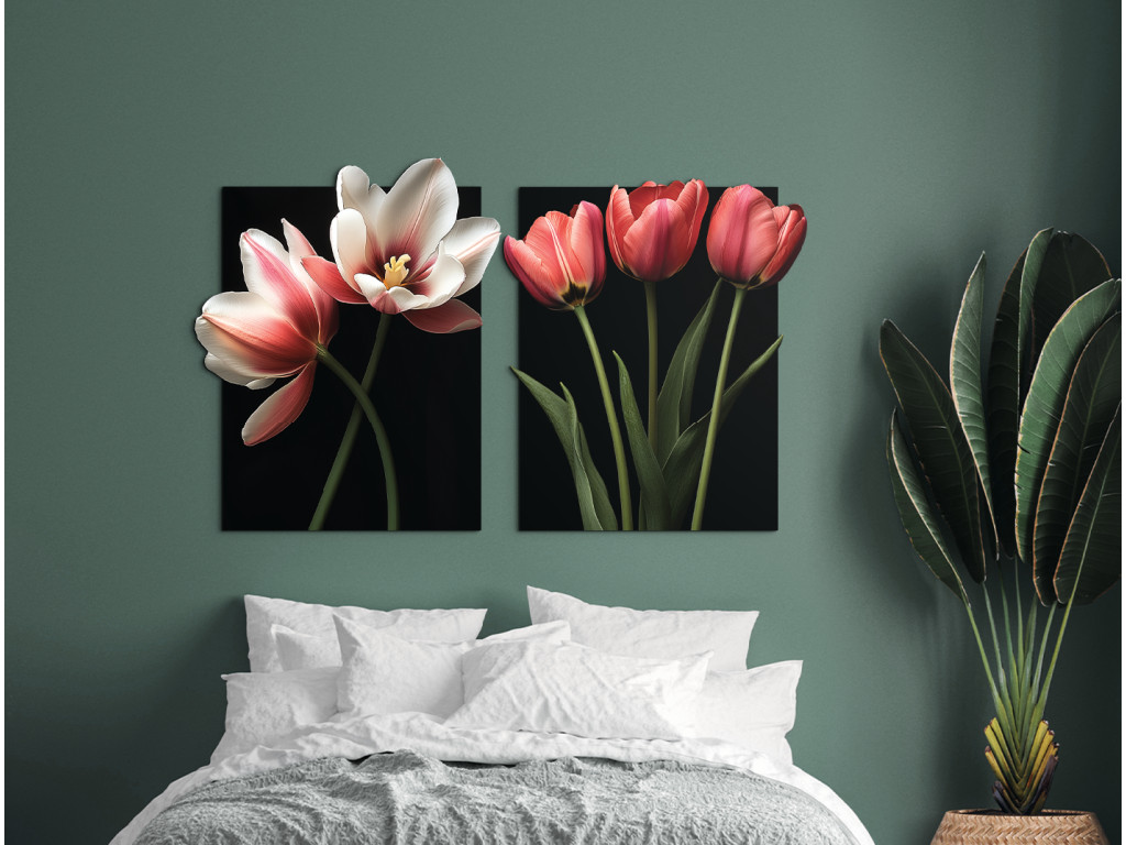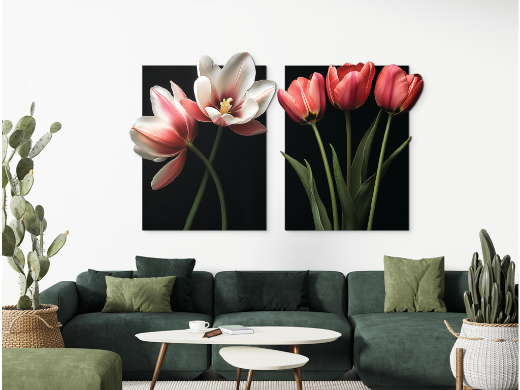 A tulipán motívumokkal díszített művészeti panelek sorozata kiegyensúlyozott vizuális párbeszédet teremt a finomság és a szenvedély között. A bal oldali panel két halvány rózsaszíntől fehérig terjedő virágot ábrázol finoman kinyílt szirmokkal, míg a jobb oldali panel három mélyvörös tulipán formájában teremt kontrasztot – a szerelem és a romantika szimbólumai. Együtt harmonikusnak és elegánsnak tűnnek, dekoratív akcentusként érzelmeket és esztétikát visznek a térbe.