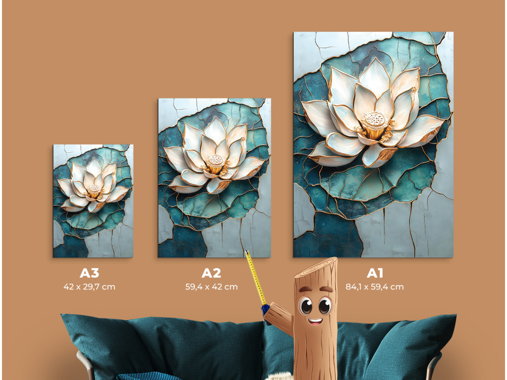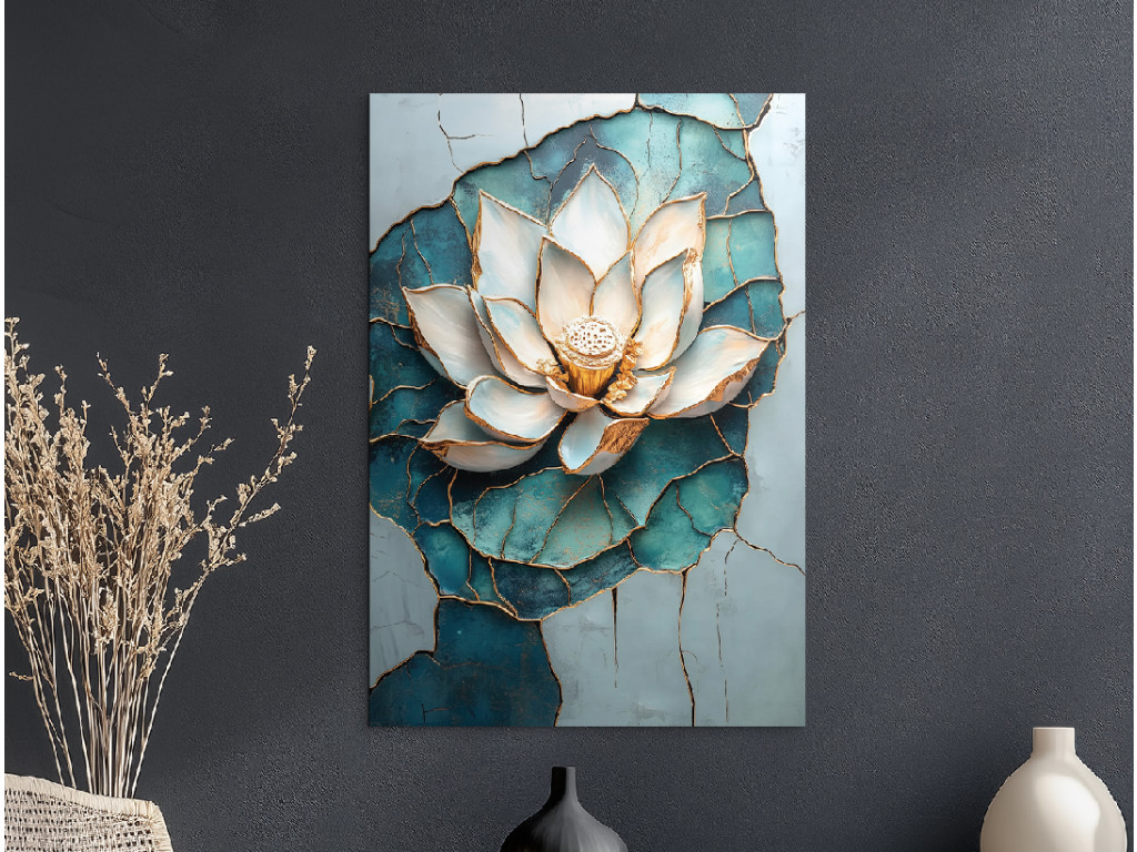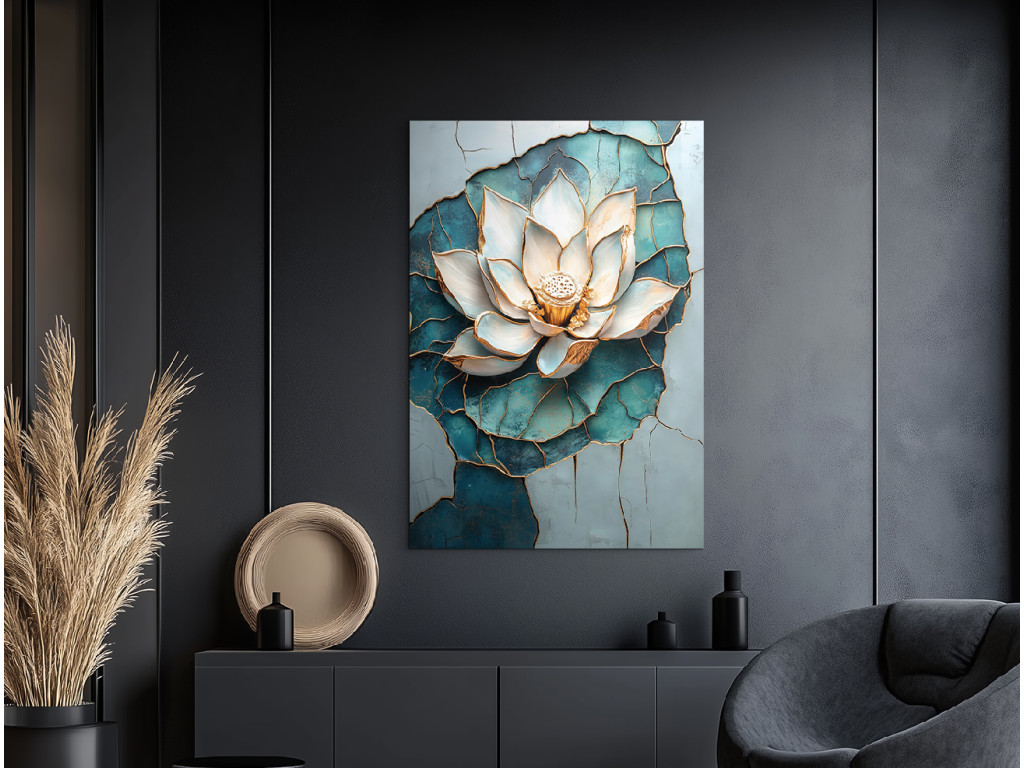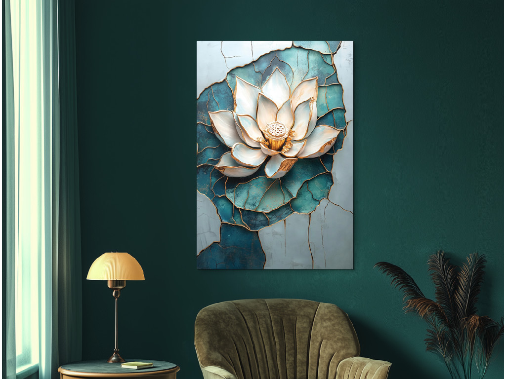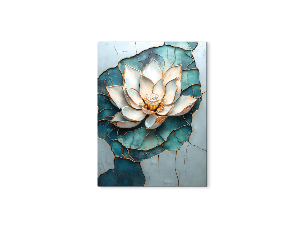 A mozaik tündérrózsa egy finom, mégis kifejező atmoszférájú festmény – egy fehér tündérrózsa kiemelkedik a szürke, zöld és arany árnyalatú háttérből, töredezett mozaikra vagy repedezett felületre emlékeztetve. A virág tisztasága és a strukturált háttér közötti kontraszt kiegyensúlyozott vizuális benyomást kelt, amely tele van eleganciával és békével. Ideális kiegészítője egy modern enteriőrnek, ahol visszafogott tónusai és harmonikus kompozíciója kiemelkedik.