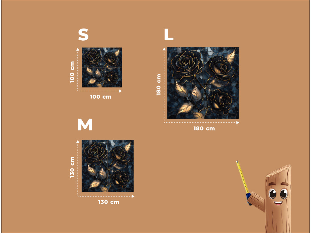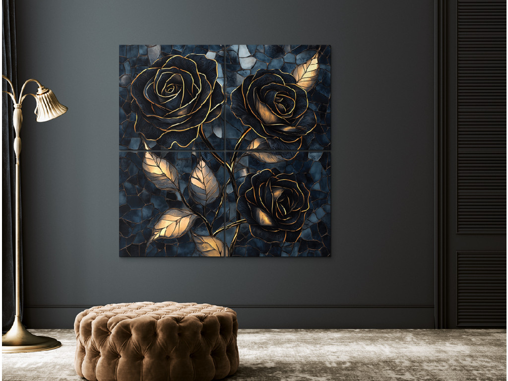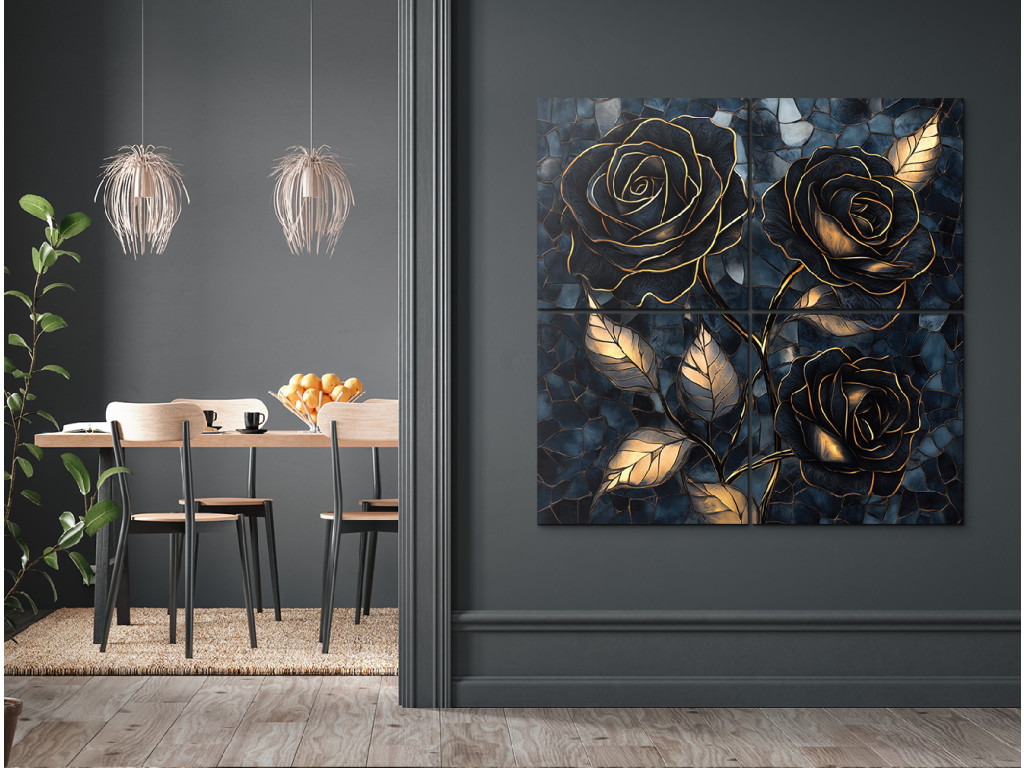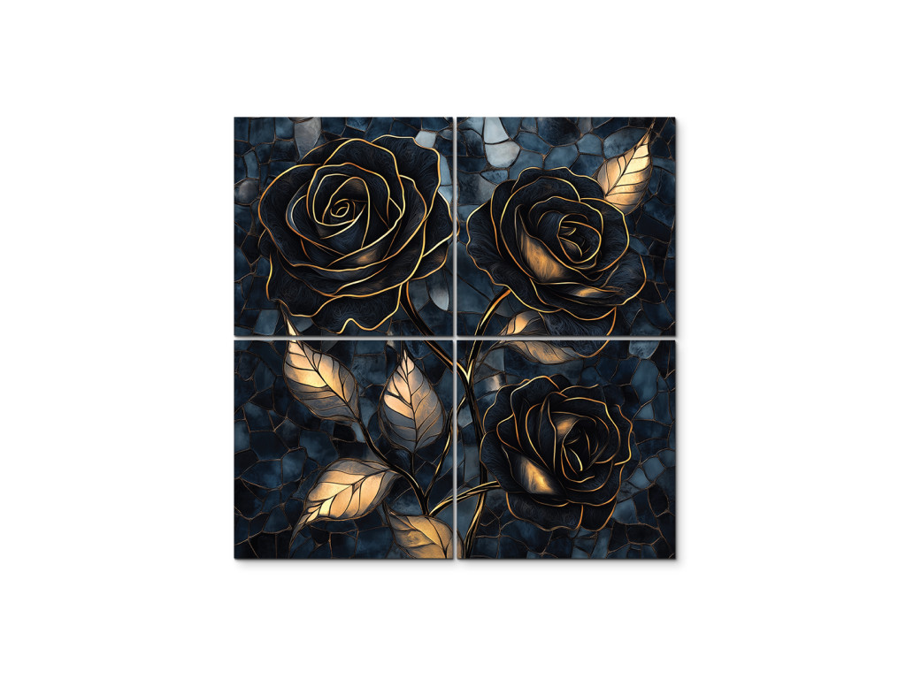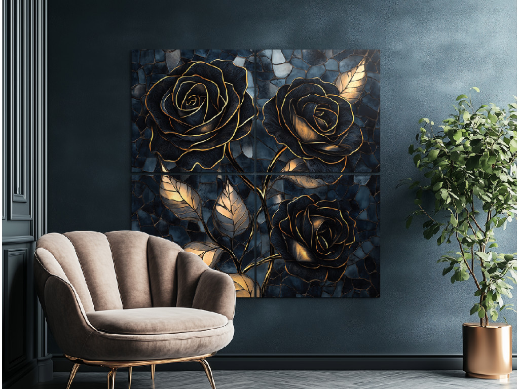 Az Arany hármasrózsa egy négyrészes dekoratív kép, amely három fekete–arany rózsát ábrázol mélykék, mozaikos háttérel. A fényűző arany tónusok, a sötét virágok és a strukturált háttér elegáns, kissé misztikus hangulatot teremtenek. Kiválóan illik kifinomult enteriőrökbe – például a nappaliba, a hálószobába vagy a dolgozószoba falának domináns elemeként.