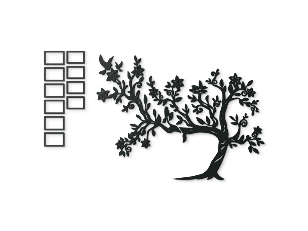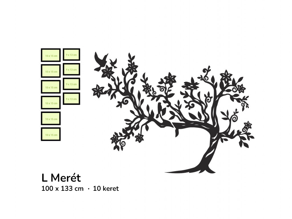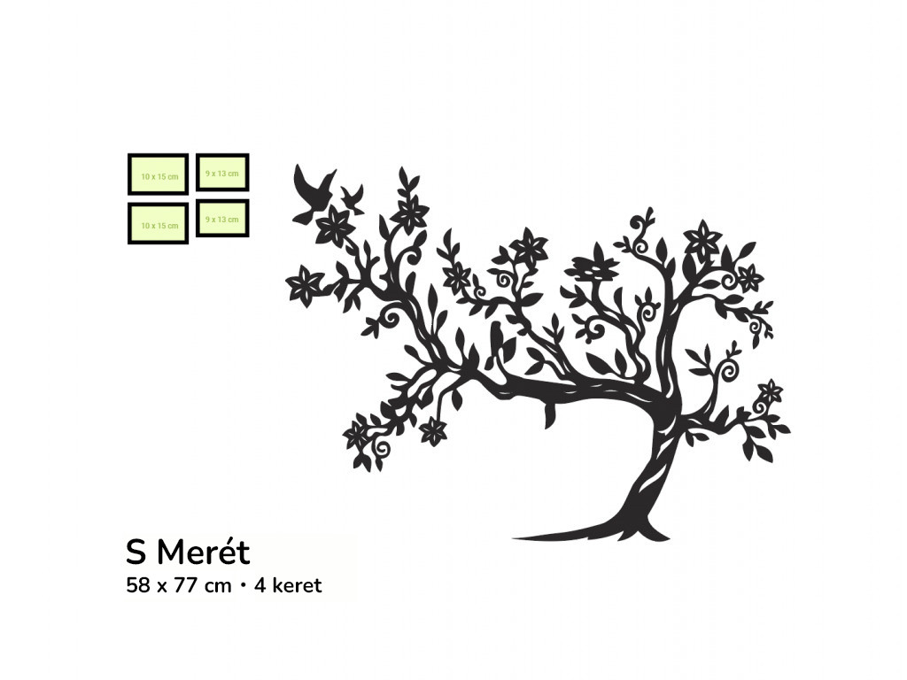 A falon lévő képkeret egy nagy törzsből áll egy szélesen növő fa virágzó ágaival, amelyre a mellékelt képkereteket helyezheti el. Az S méret 4 keretet tartalmaz, az M 7-es méretű és az L 10-es változatot jelent. A csomagban 2 db repülő szerelmesmadarat is talál, amiket elhelyezhet a fa körül vagy önállóan. Az elemek elhelyezésénél a kreativitásnak nincs határa, így szabadon választhatja meg a fotók vízszintes vagy függőleges irányát. A termék kizárólag keretekből áll, nem tartalmaz üveget vagy egyéb anyagot.