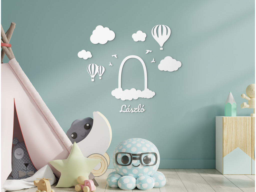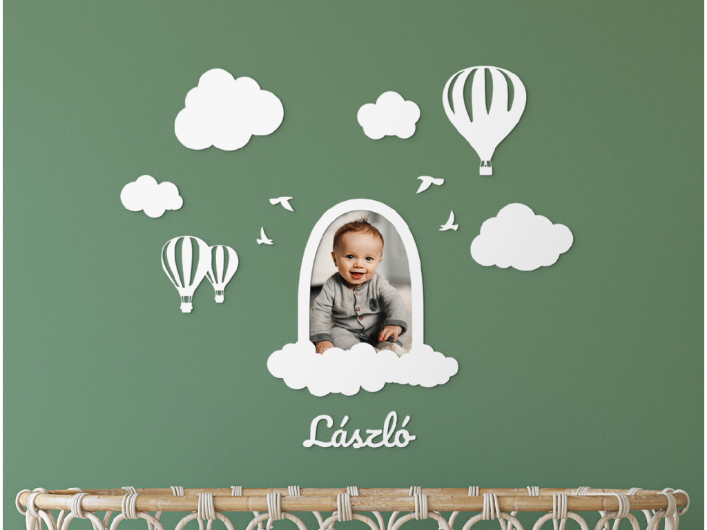 Az eredeti képkeretnek köszönhetően otthon is kiállíthatja a kicsi portréját, ami egyben aranyos dekoráció is. A gyerekszobába szánt fa képkeret lufikat, felhőket, madarakat és a baba nevét is tartalmazza, amit szabadon elrendezhet és felragaszthatja például a kiságy fölé.
