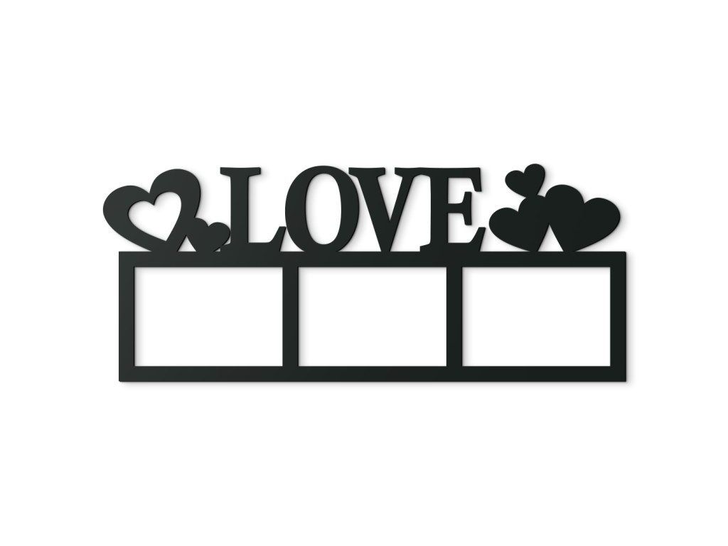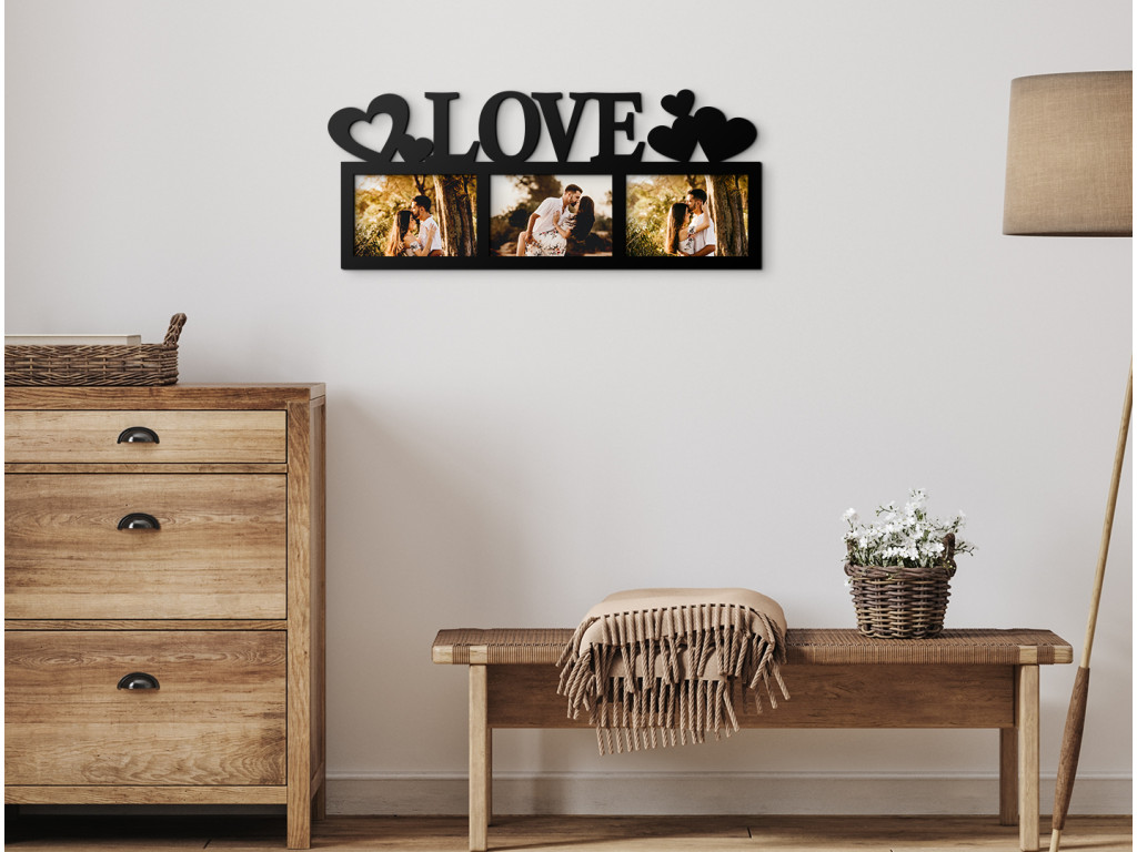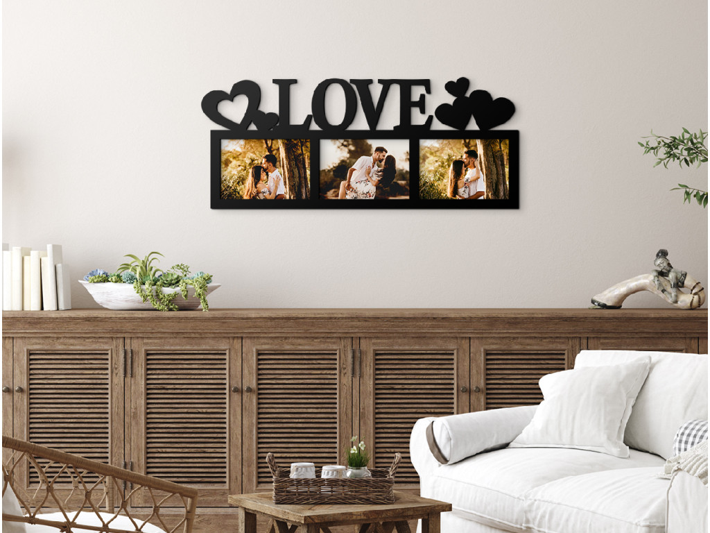 Ha kedvenc fényképei vízszintes tájolásúak, ez a képkeret ideális választás lesz számukra. Minden nap láthatja kapcsolata legjobb pillanatait, nem csak az album mélyén. A dekoráció 3 fotónak ad helyet, és az angol LOVE feliratból és öt szívből áll. Jelenleg több dekor közül választhat, amelyek könnyen hozzáilleszthetők akár a bútorokhoz, akár a fal színéhez. A termék csak keretből áll, nem tartalmaz üveget vagy egyéb anyagot.