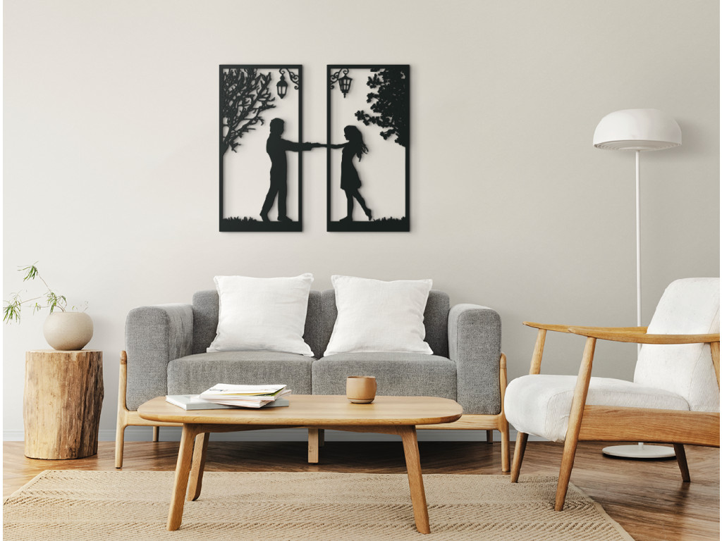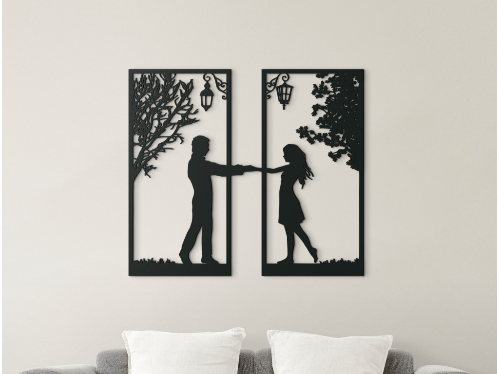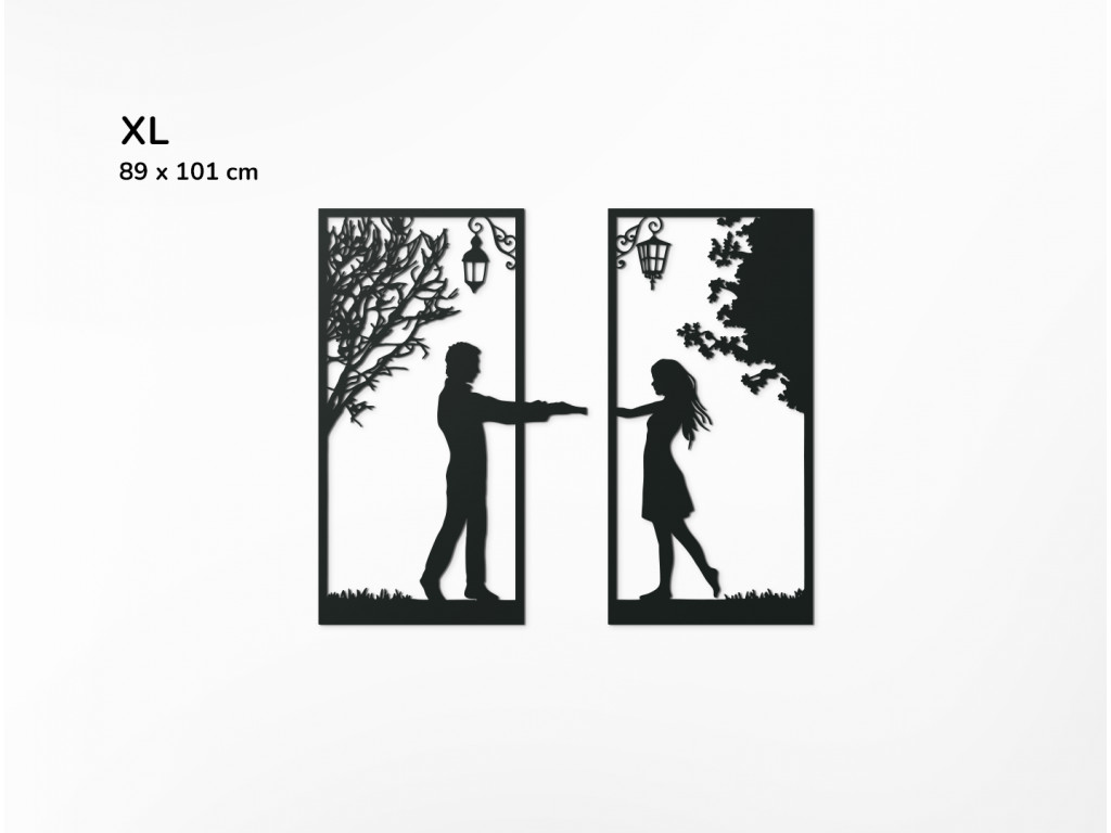 Ez a modern fakép akár a nappali falát is díszítheti. Egy szerelmes pár fogja egymás kezét a kép keretein keresztül, így tartják össze a két darabot. Egy férfi áll a bal oldalon, egy lány a jobb oldalon. Mindketten fák és lámpák alatt állnak.