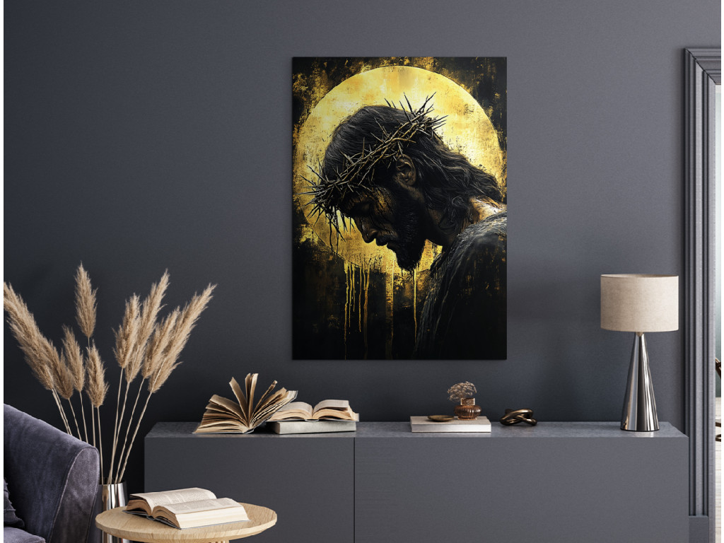 A festmény Jézus Krisztust lehajtott fejjel, töviskoronával a fején, csendes, alázatos pózban ábrázolja. A fekete és arany árnyalatú sötét háttér kiemeli glóriáját, amely ragyog és mély spirituális elmélkedés légkörét teremti. A festmény a modern dizájnt spirituális szimbolikával ötvözi, így ideális egy erős hitet közvetítő enteriőrbe