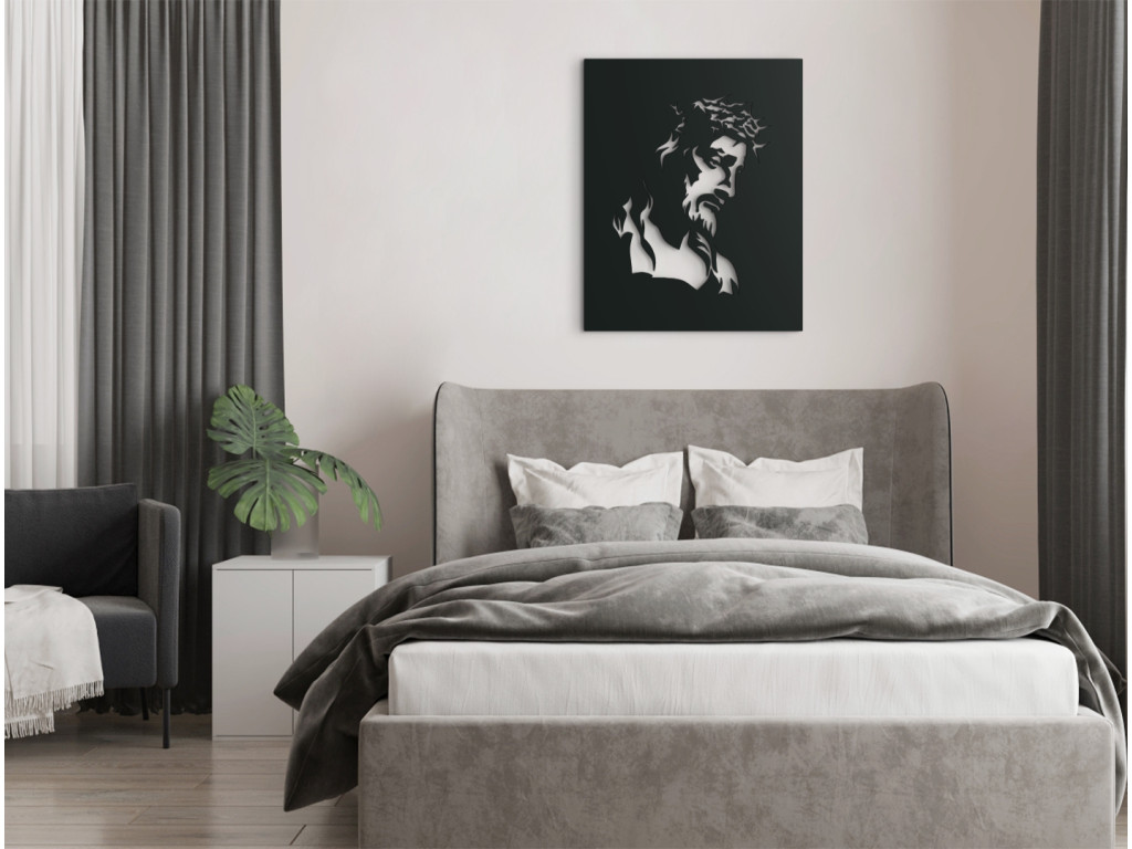 Jézus képe töviskoronával modern kivitelben. Jézus Krisztus faképe alkalmas a hálószoba, a nappali és a folyosó falára. Az ábrázolt Jézus a földre néz, békés hangulatot hoz a belső térbe.
