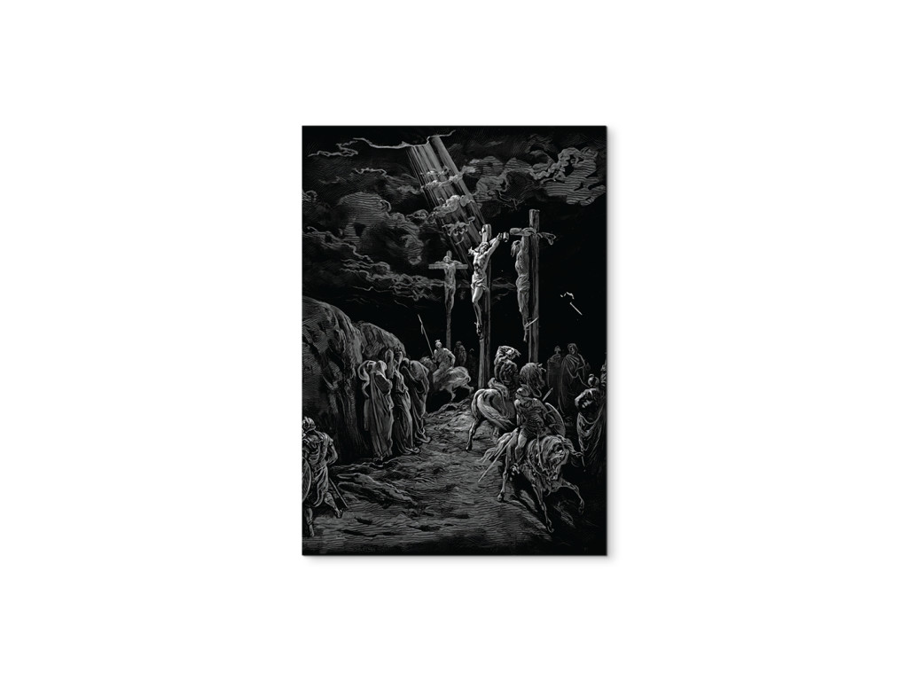 A Keresztrefeszítés sötétje falikép drámai kompozícióban idézi meg Jézus Krisztus keresztre feszítését, Gustav Doré jellegzetes világ–árnyék ellentéteivel, monokróm erővel. A kereszt alatt kavargó emberek és katonák kaotikus tömege, a sötét, viharos égbolt és a fény kontrasztja a jelenet spirituális súlyát és szenvedését hangsúlyozza. Szimbolikában gazdag, gondolatébresztő mű, meditatív atmoszférával.