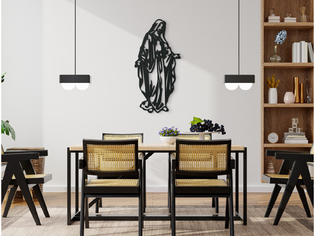 A modern Szűz Mária-kép minden látogatót kellemes érzéssel tölt el. A finom vonások és a minimalista dizájn békét és kellemes hangulatot hoz a belső térbe. Szűz Mária képe olyan érdekes részletekkel tűnik ki, mint a hiányzó arc vagy nyitott kezek. A dekoráció különösen alkalmas a modern terekbe.