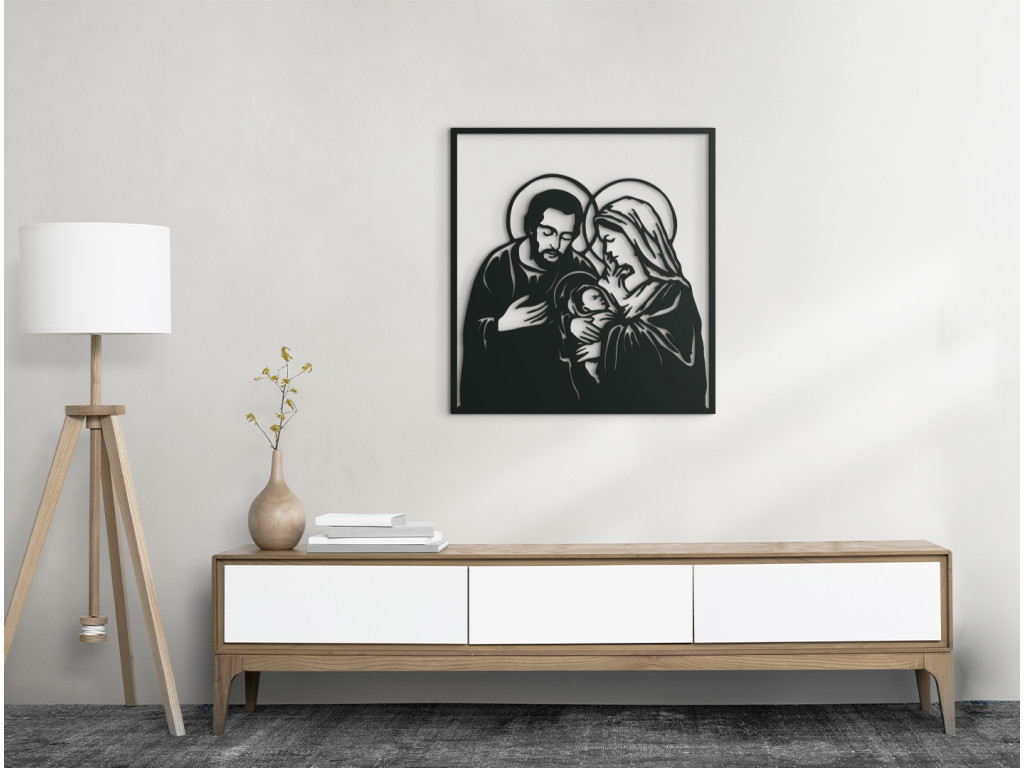 Mária, József és a kis Jézus egy modern kép formájában a figyelem középpontjába kerülnek. Józsefet és Máriát ábrázolja, amint karjukban tartják a kis Jézust. A Szent család faképe nappali vagy hálószoba falára is megfelelő.