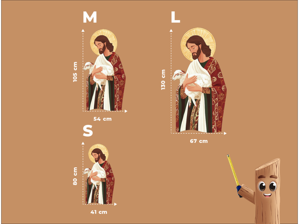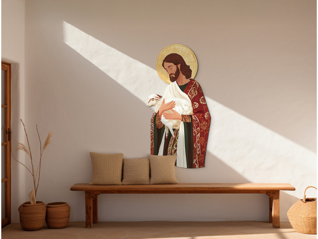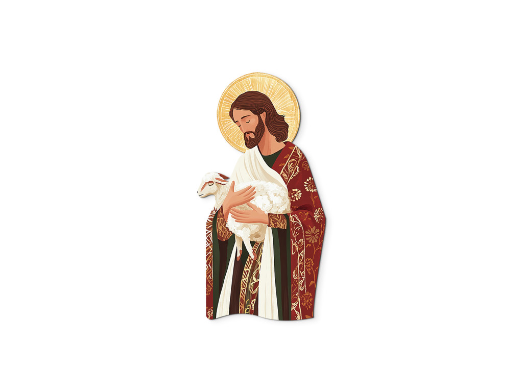 Az illusztráció a rajzolt Jézus képét ábrázolja, mint a Jó Pásztort, piros palástba öltözve – a szeretet és az áldozatvállalás szimbólumaként. Gyengéden tart egy bárányt a karjában, amivel kifejezi gondoskodását, védelmét és közelségét azok iránt, akik követik. Az egyszerű és barátságos művészi stílus kedvessé és könnyen befogadhatóvá teszi ezt az alakot, ideális gyermekek számára vagy a hitről szóló tanítás részeként.