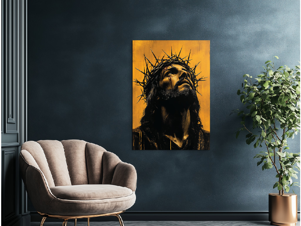 A Megváltó arca kép erősen érzelmes alkotás, amely Jézus Krisztus arcát mutatja töviskoronával, csendes szenvedést és mély békét sugározva, enyhén lesütött tekintettel, mintha a világ terhét hordozná, mégis szeretetet és megbocsátást üzenve. A visszafogott, többnyire sötét árnyalatokból álló színpaletta felerősíti a mű spirituális és szimbolikus jelentését, miközben a tekintet mélysége és a töviskorona jelképisége különösen hatásossá válik.