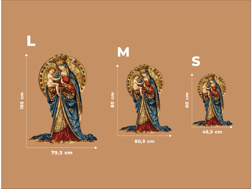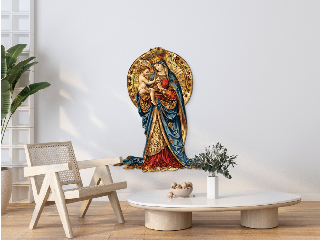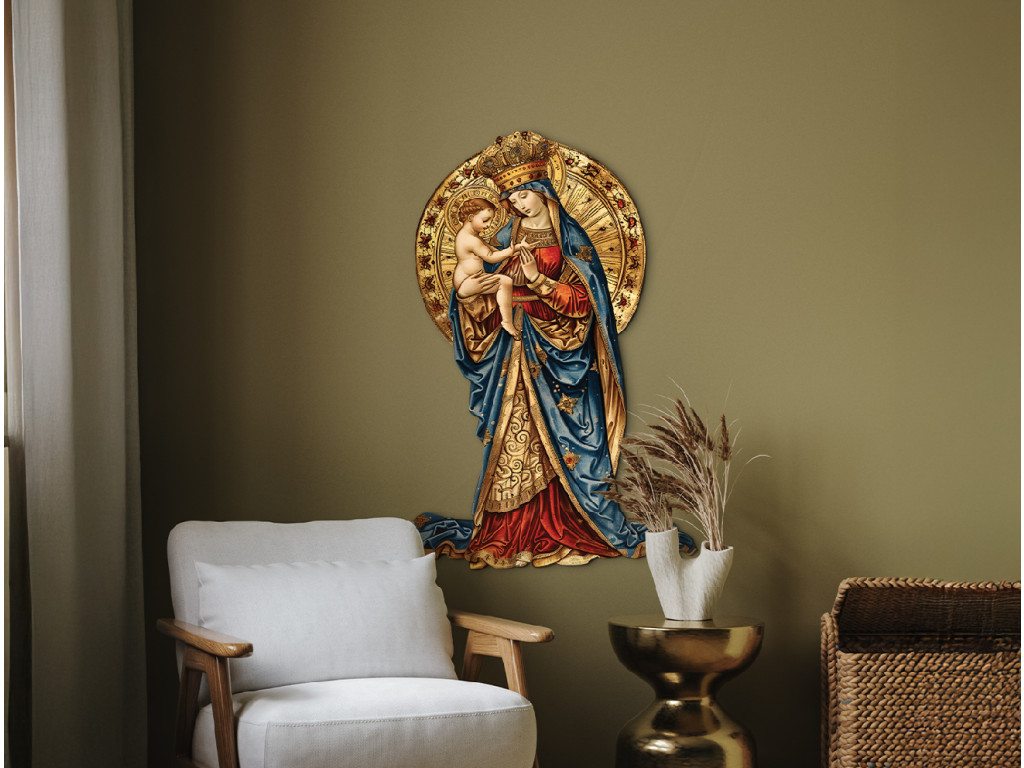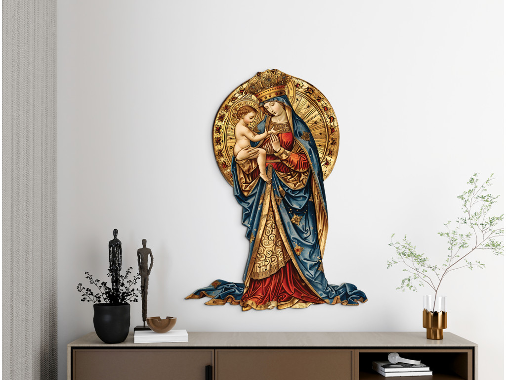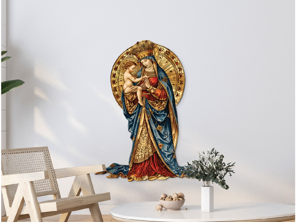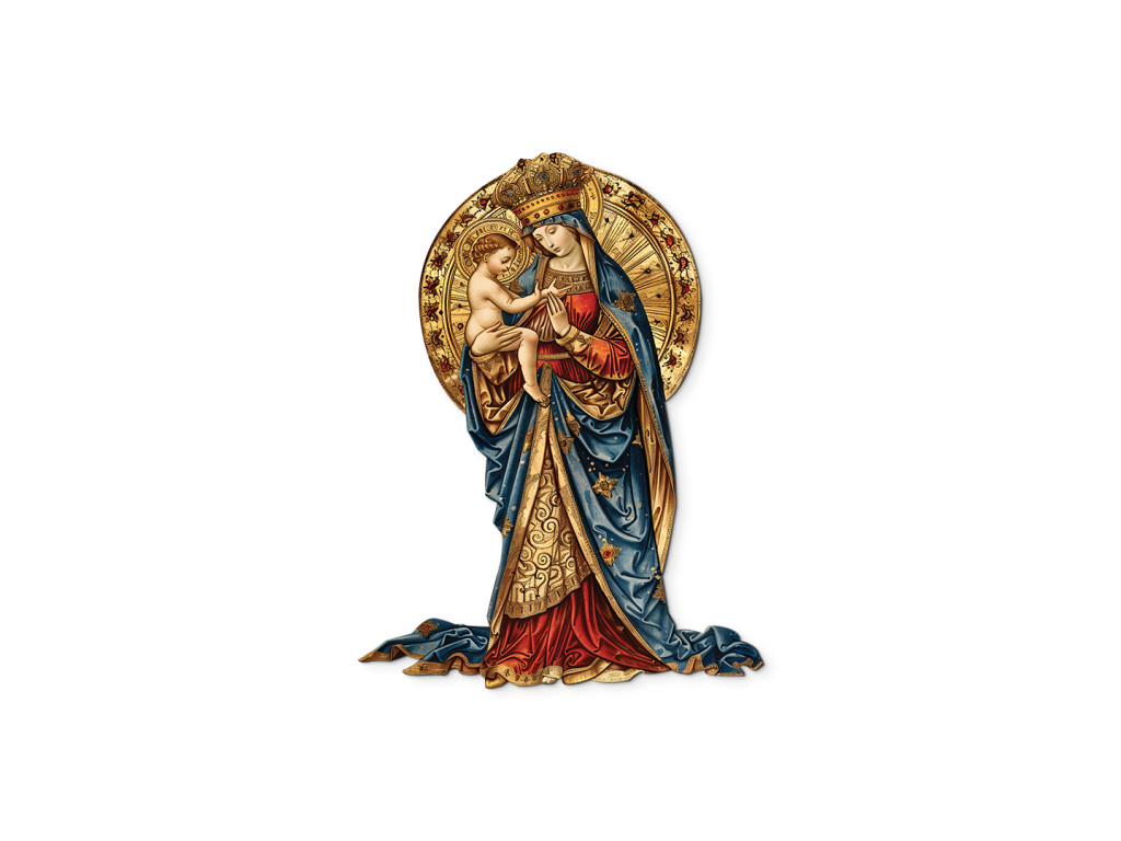 Az Arany Madonnával és Gyermekkel kép teljes alakos ábrázolást mutat: a koronás Szűz Mária karjában tartja a kis Jézust, a kompozíció pedig egységesen aranyló tónusokban ragyog, kiemelve a spirituális fenséget és a mennyei eredetet. Az arany megjelenés a szentséget, az örökkévalóságot és az égi dicsőséget szimbolizálja, míg Mária koronája az Ég Királynőjeként betöltött szerepét fejezi ki. Ez a típusú ikon a Jóisten Anyja iránti klasszikus tiszteletet hordozza, mint a szeretet, oltalom és remény forrása.