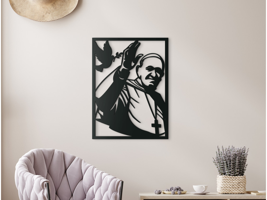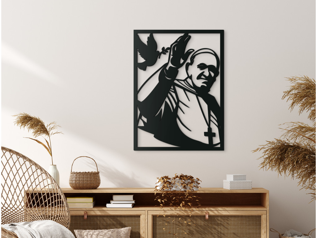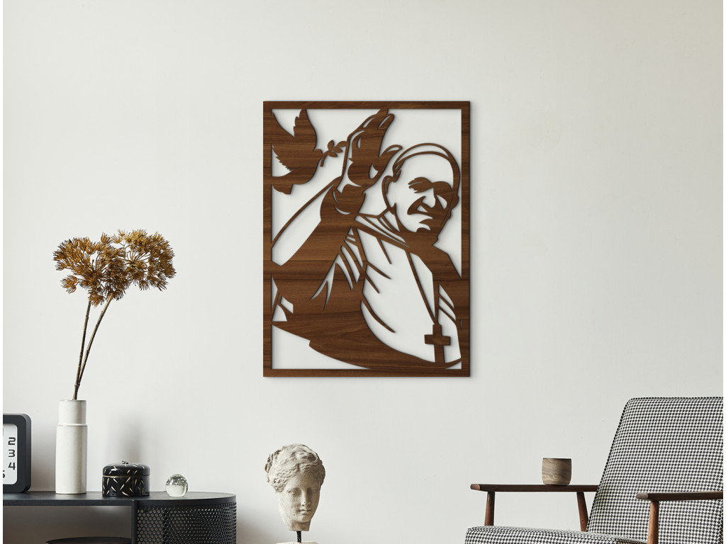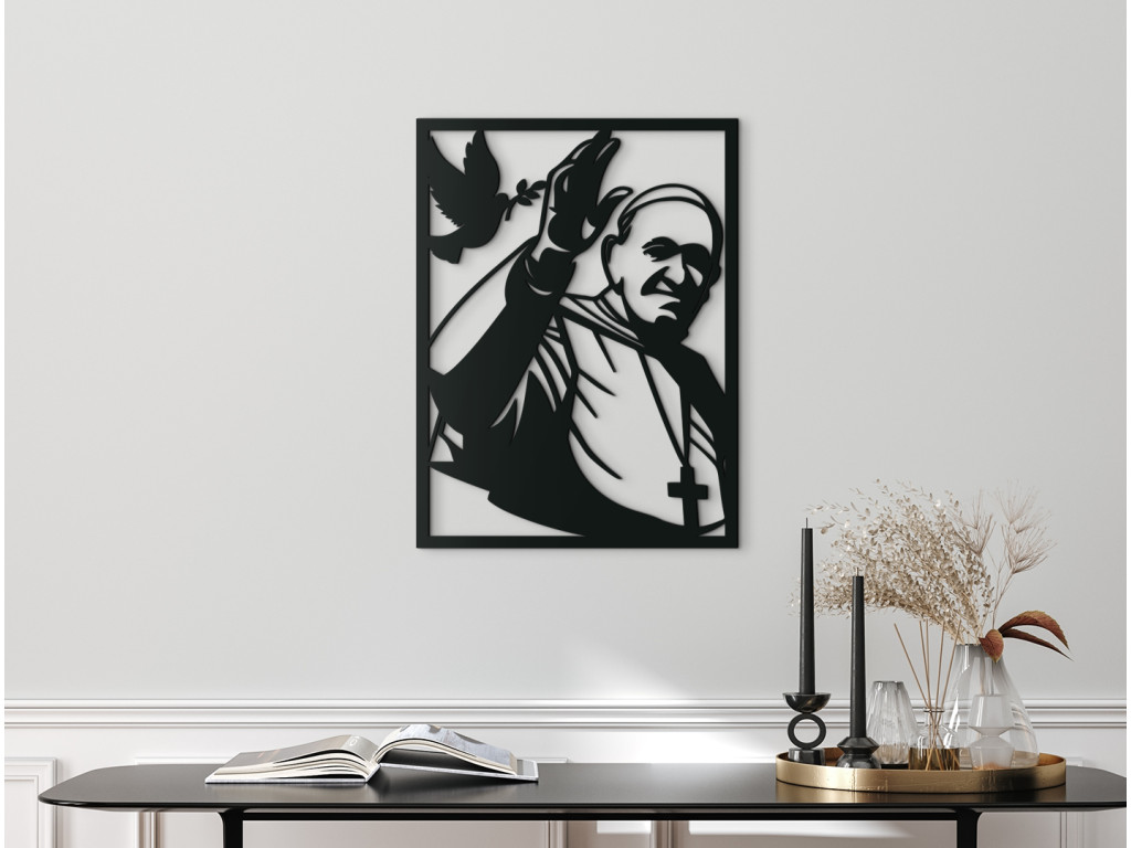 A Ferenc pápa portréját ábrázoló fa kép precíz faragással készül, 3 mm vastag, kiváló minőségű HDF lapba. Egyszerű, mégis jellegzetes kialakításának köszönhetően méltóságteljes és elegáns megjelenést kölcsönöz. Minden pillantás a hitre és a reményre emlékeztethet.