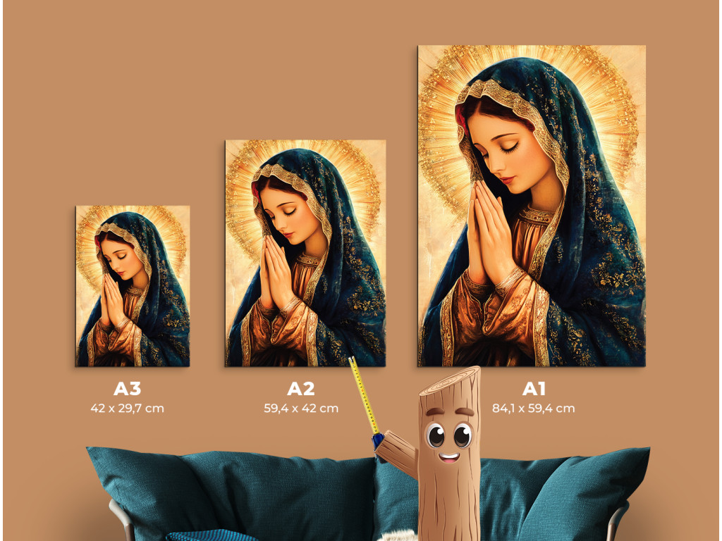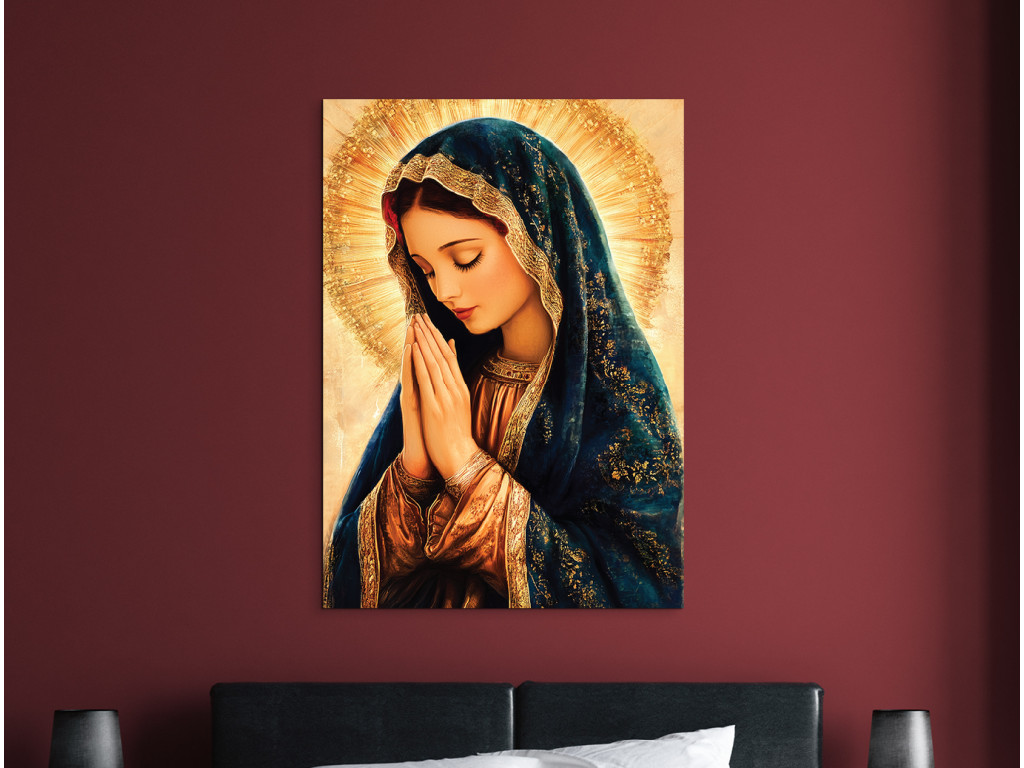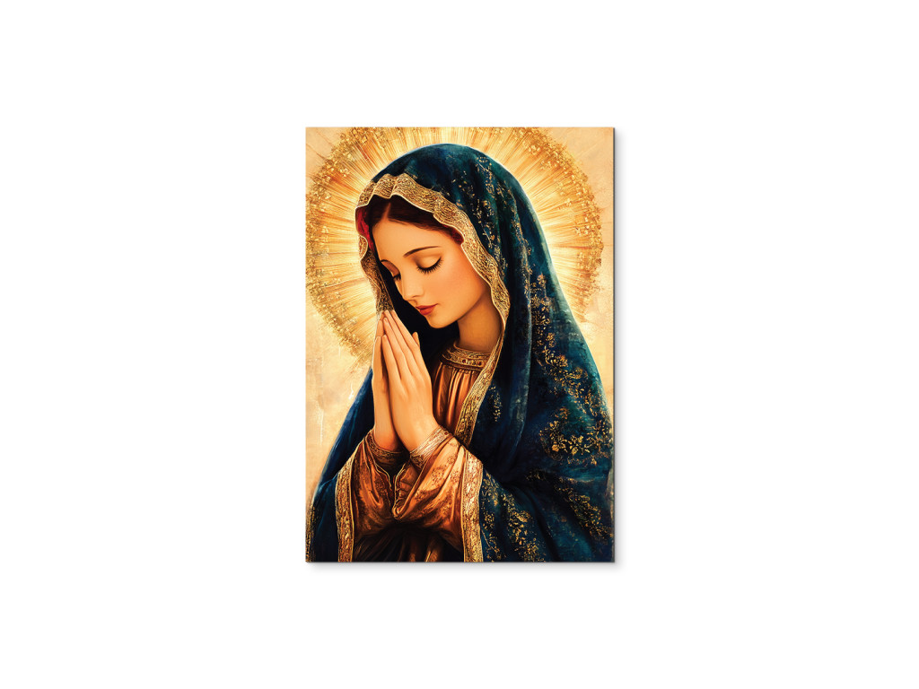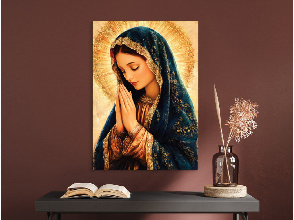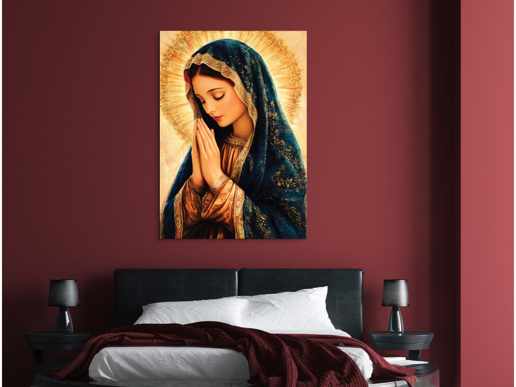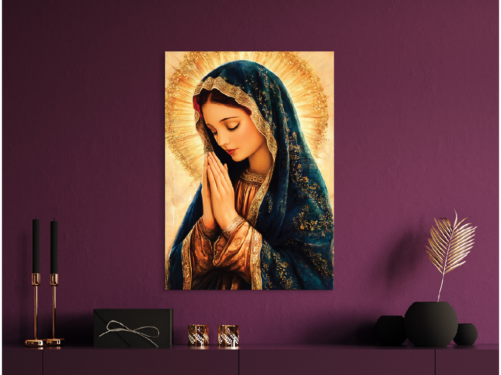 A Szent Istenanya kép a Szűz Máriát csendes, alázatos Anyaként mutatja mély imában: feje enyhén lehajtva, kezei összekulcsolva, arca pedig békét és odaadást sugároz, miközben hagyományos kék palástot visel arany glóriával, amely kiemeli spirituális tisztaságát és Istenhez való közelségét. A kompozíció megnyugtató, és belső elcsendesedésre hív.