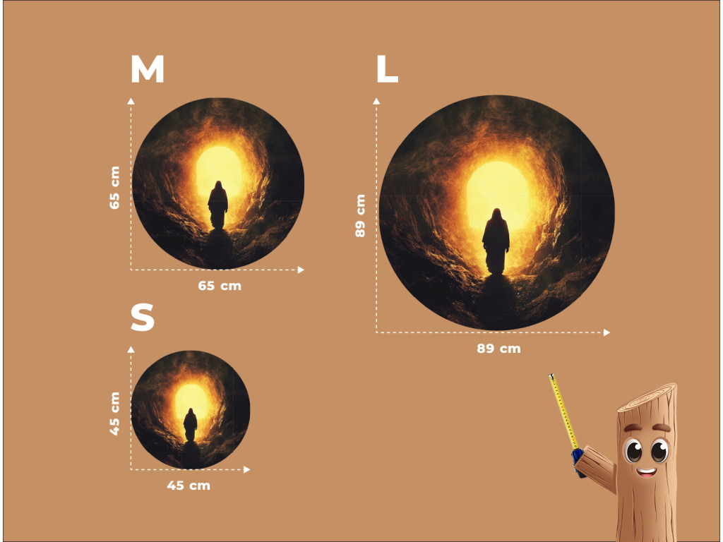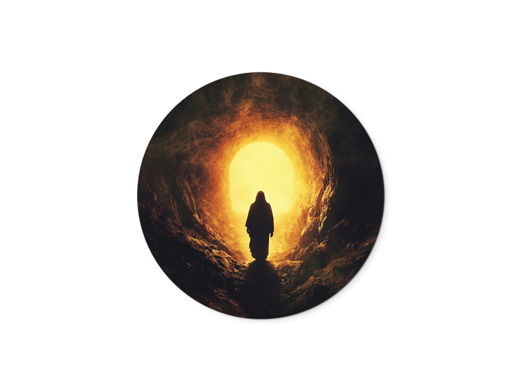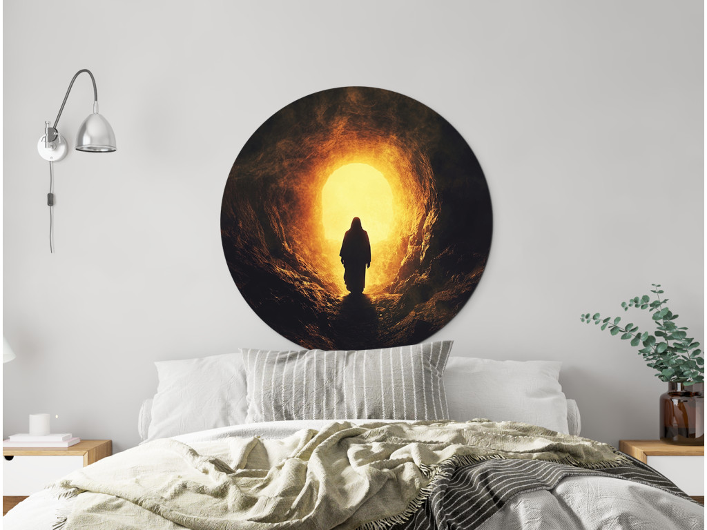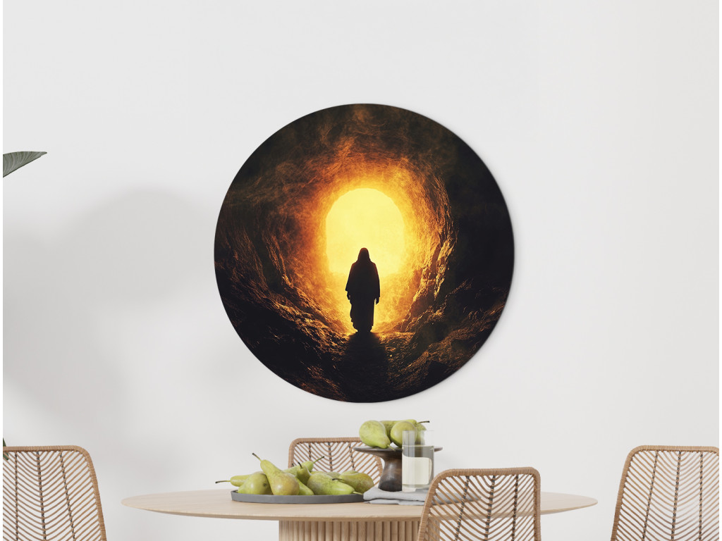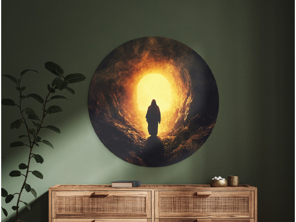 A Feltámadás fénye kerek falikép egy sötét barlangból kilépő sziluettet mutat, a bejáraton át áradó fény a remény és az újjászületés jelképe. Az elgördített kő bibliai utalás a Jézus‑történetre, a győztes élet és a megváltás üzenetével, amely kellemes nyugalmat és hitet áraszt.