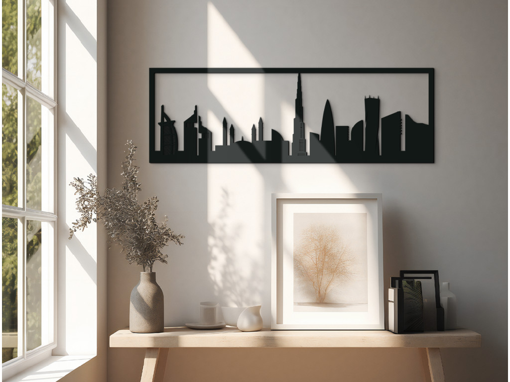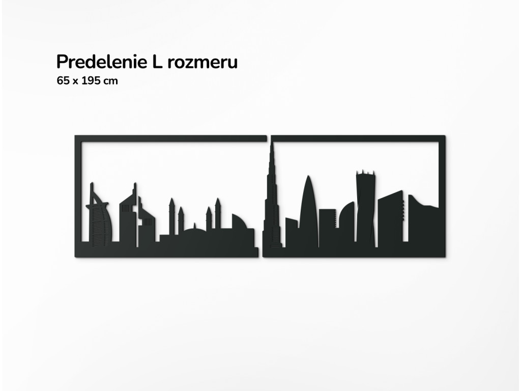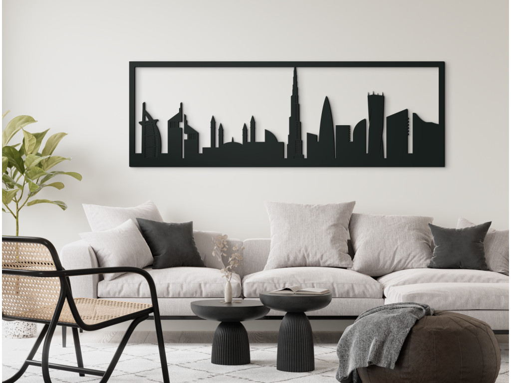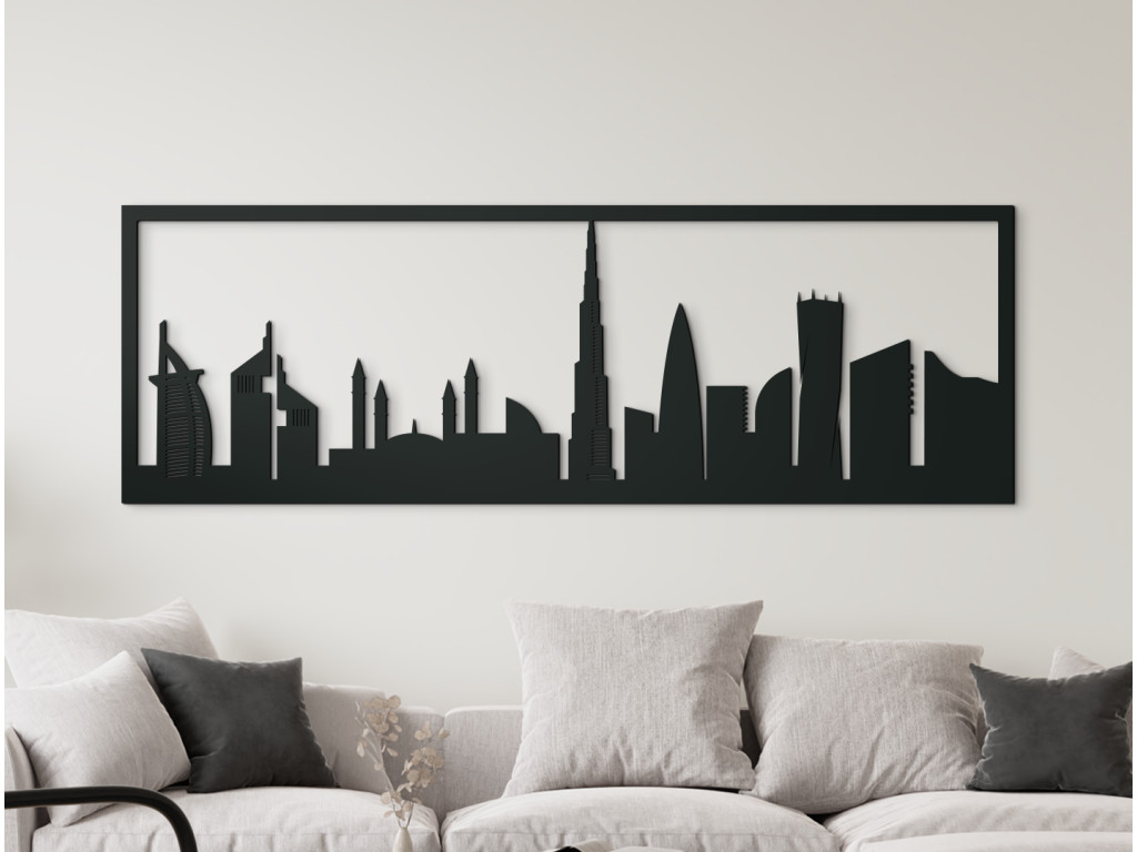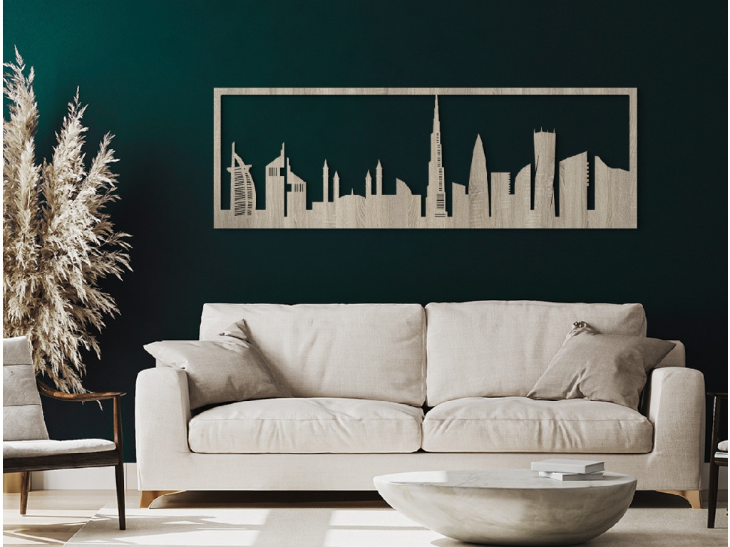 Itt található (balról) a világ legfényűzőbb szállodája, a Burj al-Arab (Burj Al Arab vagy az Arabok tornya) vitorlás hajó sziluettjével, amely egyben a legtöbb csillaggal rendelkezik. Ebből legalább 7-et tulajdonítanak neki! Az ember alkotta szigeten és a Jumeirah strandon található. A panoráma a Jumeirah Emirates Towers Hotel két felhőkarcolójával és az Egyesült Arab Emírségek legnagyobb mecsetjével, az Al Farooq Omar Bin Al Khattabbal folytatódik az Al Safa negyedben. Szerkezetileg az isztambuli Kék mecset ihlette, és ez volt az első, amely megnyitotta kapuit a nem muszlimok előtt. A Burj Khalifa, amely 2010-ben a világ legmagasabb épülete lett, uralja Dubait és az arculatunkat is. Hihetetlen 828 méteren a többi felhőkarcoló versenytársa még a sarkát sem éri el. A 90 fokkal megcsavart Cayan Tower épülete azonban mindenképpen vonzza a tekintetet. A Dubai fából készült festmény azonban sokkal többet ragad meg széles panorámájában, ami tökéletessé teszi a kanapé, TV, ágy, az irodában vagy egy hosszú folyosó feletti fal szabad terének kitöltésére.