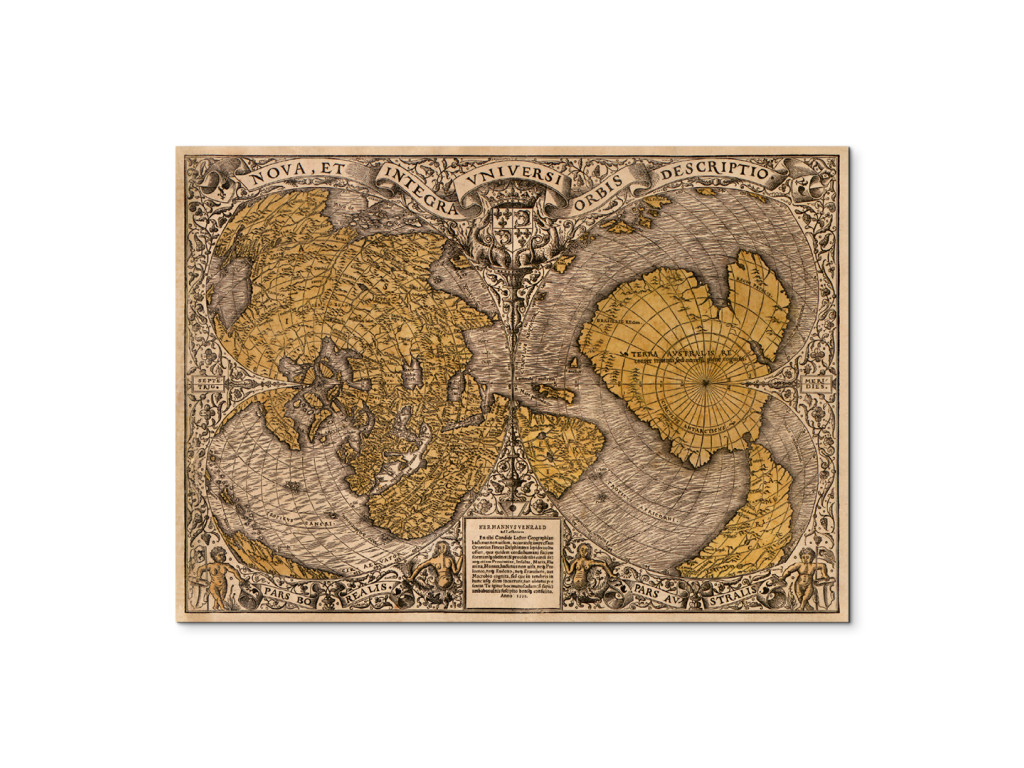 A francia térképész Oronc Fineus (Orontius Fineus) 1531-ben készült Nova et integra universi orbis című történelmi világtérképe a Földet két félgömbben ábrázolja, gazdag díszítő szegéllyel. Érdekes látványosság a hatalmas déli kontinens, Terra Australis, amelynek létezése akkoriban még csak hipotézis volt. A kép felfedezői és időtlen hatást kelt, és jól illik egy dolgozószobába, könyvtárba vagy olyan belső térbe, ahol érdeklődnek a történelem és a kartográfia iránt.