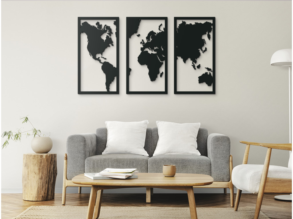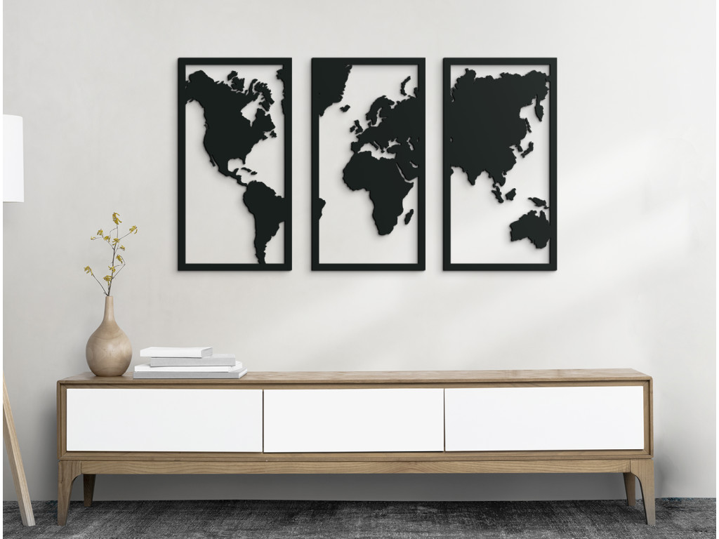 Rakjon ki egy világtérképet a falra, aminek köszönhetően minden falnak eredeti és dizájnos hatása lesz. A 3 részből álló képes világtérkép kontinenseket és szigeteket tartalmaz, amelyek a felosztásnak köszönhetően időtlennek tűnnek. A világtérkép otthoni és üzleti környezetbe egyaránt alkalmas. Egyszerűen bárhol, ahol az utazási élmények látványa megnyugtatja a lelkét.